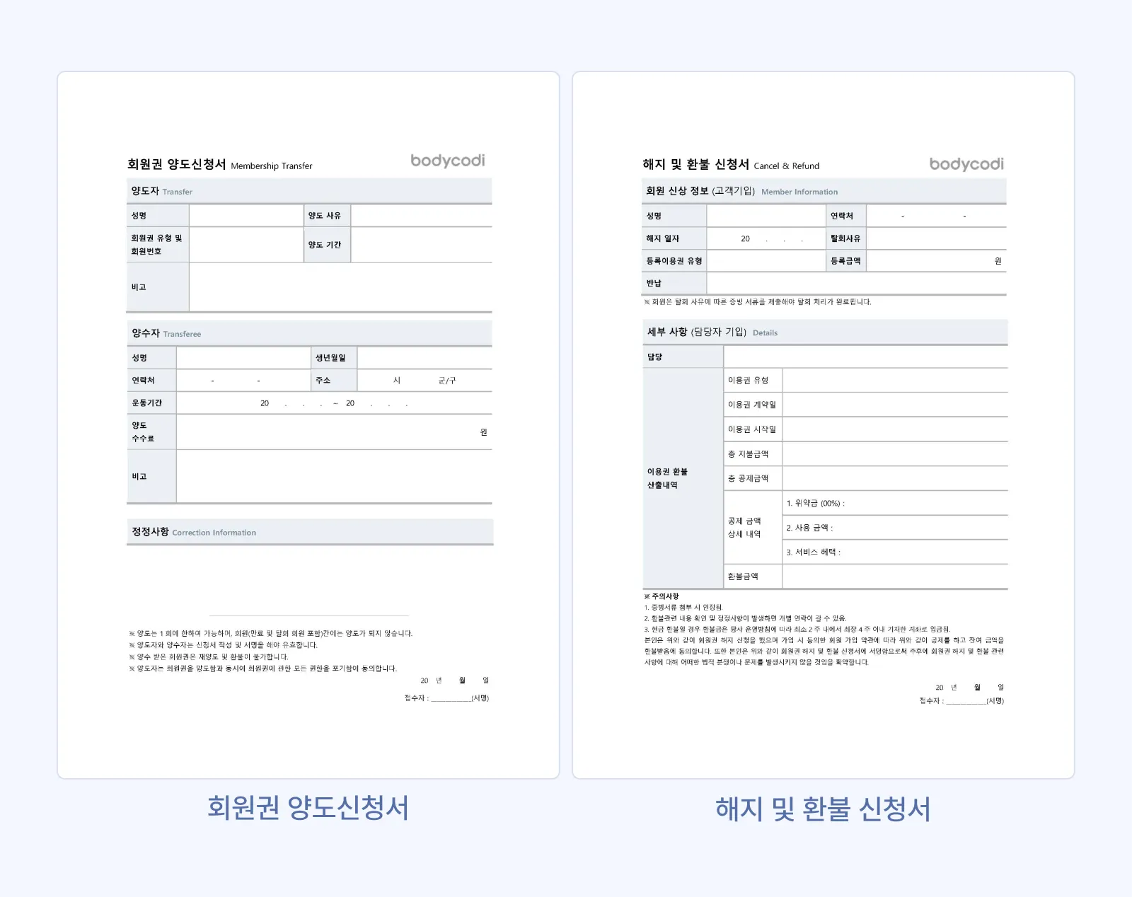 피트니스&필라테스&헬스&골프&요가 등 다용도로 사용할 수 있는 회원권 양도신청서와 해지 및 환불 신청서 샘플입니다.