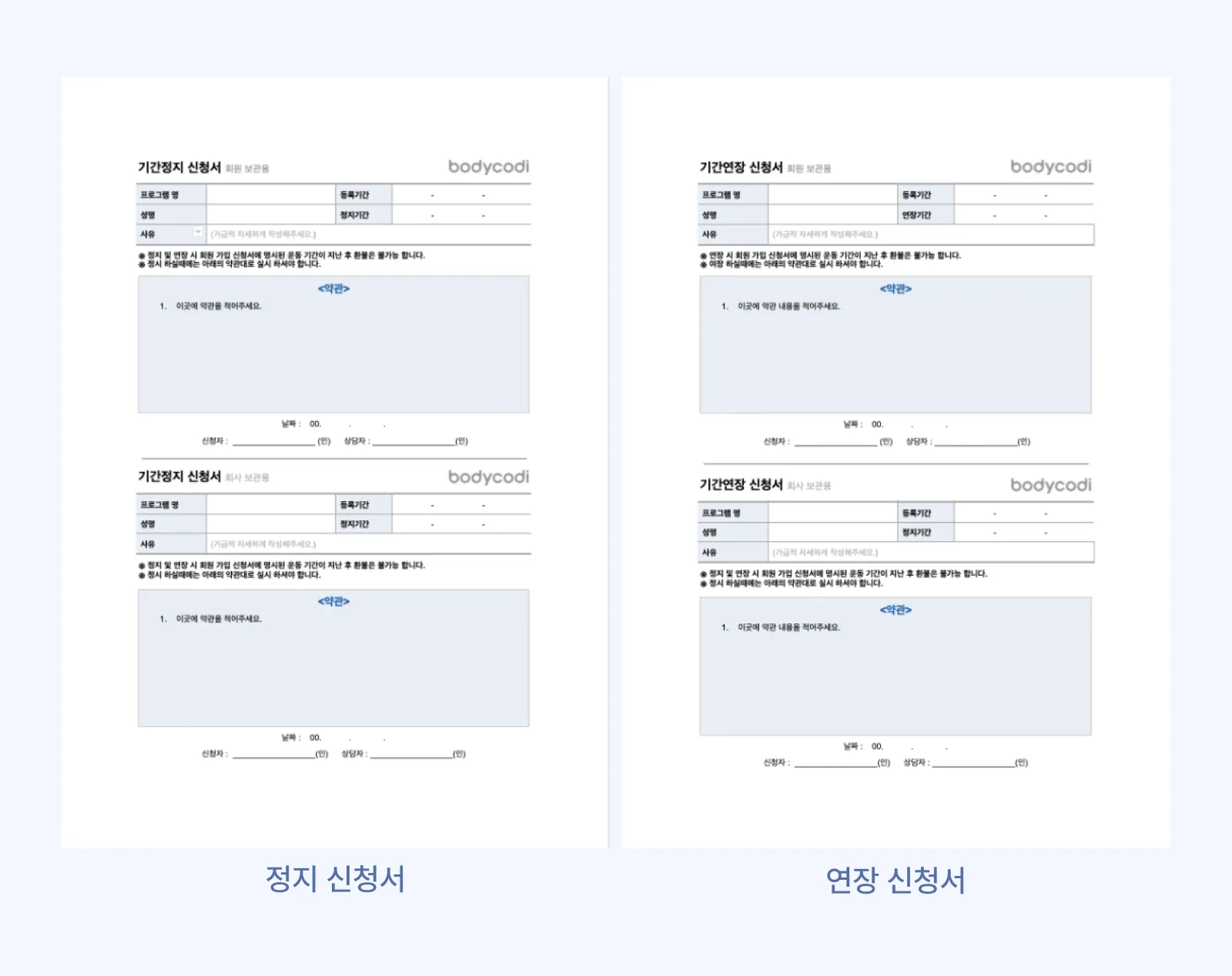 피트니스&필라테스&헬스&골프&요가 등 다용도로 사용할 수 있는 정지(휴회) 및 기간연장 신청서 샘플입니다.