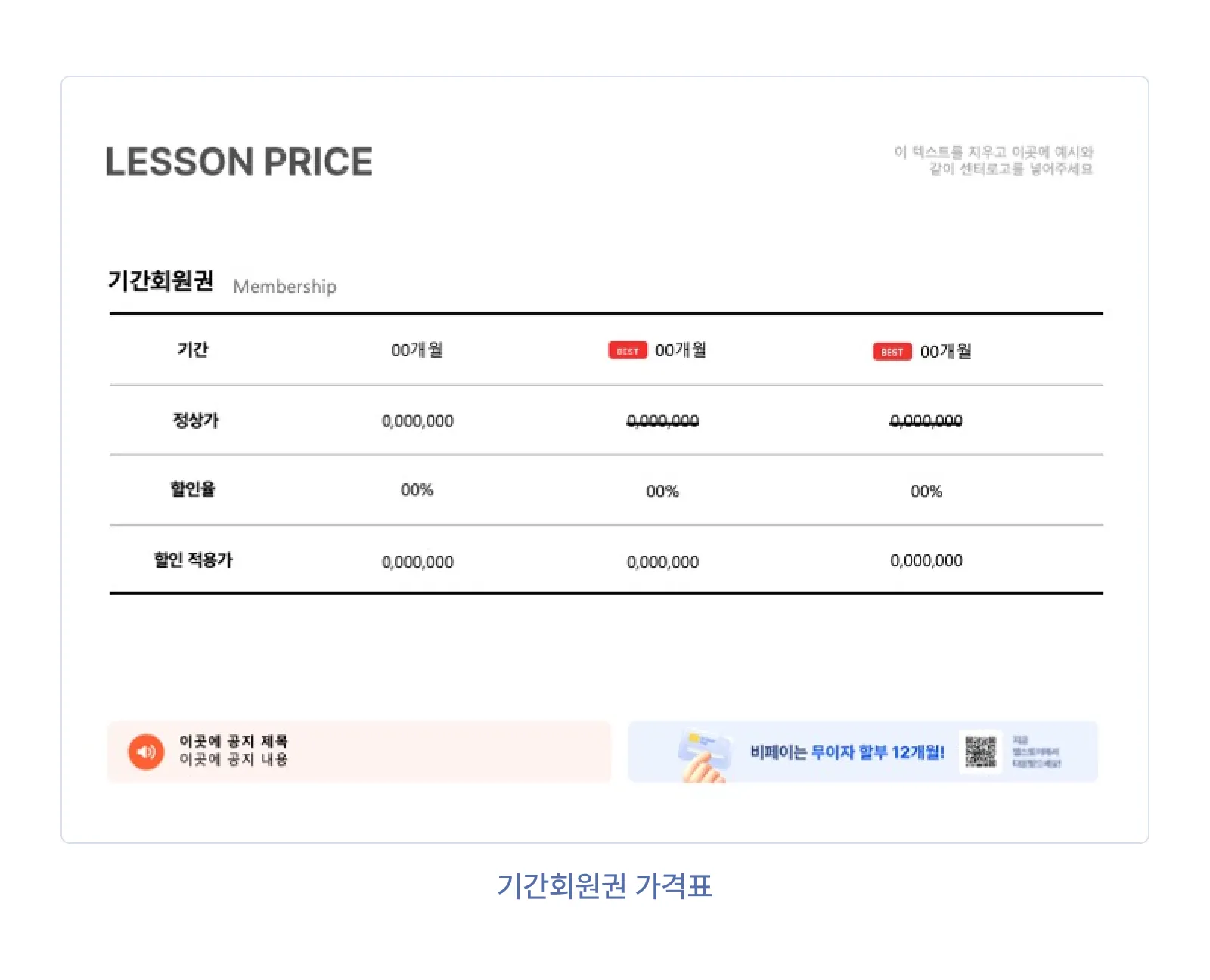 피트니스&필라테스&헬스&골프&요가 등 다용도로 사용할 수 있는 기간제 회원권 가격표 샘플입니다.