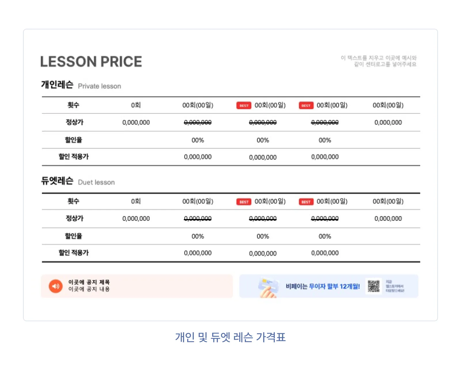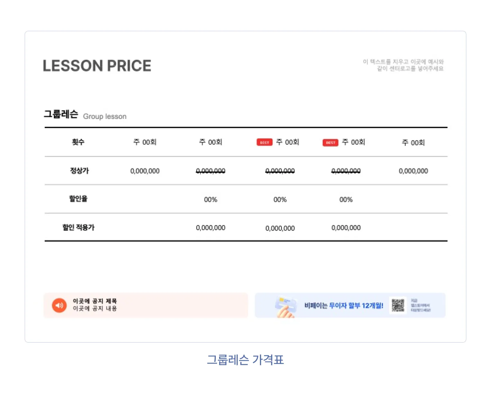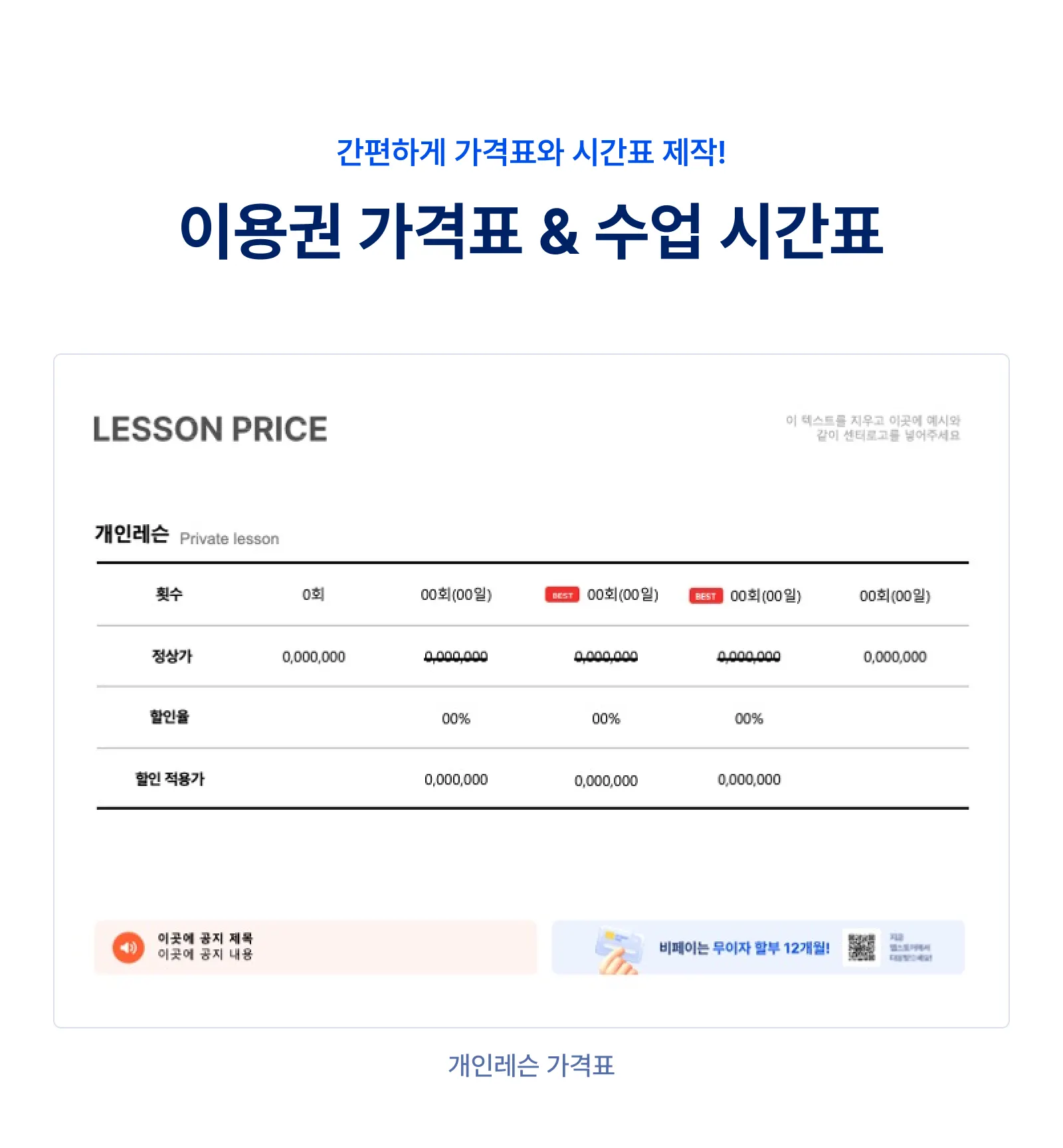 이용권 가격표와 수업 시간표 샘플도 준비되어 있어요!