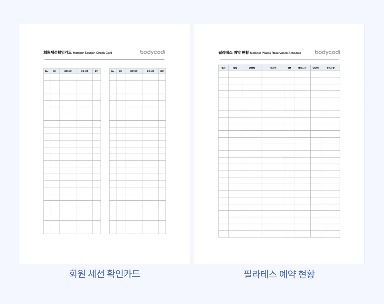 피트니스&필라테스&헬스&골프&요가 등 다용도로 사용할 수 있는 회원 세션 확인카드와 예약 현황표 샘플입니다.