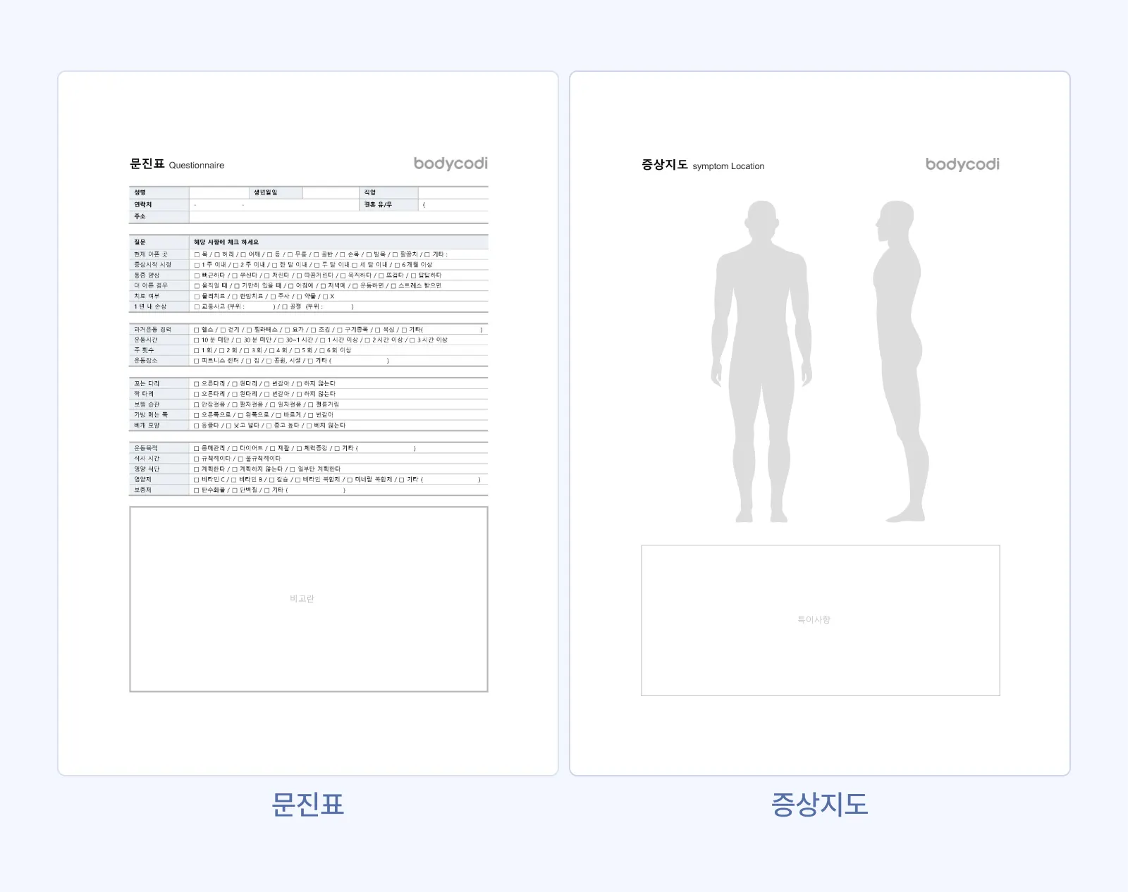 피트니스&필라테스&헬스&골프&요가 등 다용도로 사용할 수 있는 문진표와 증상지도표 샘플입니다.