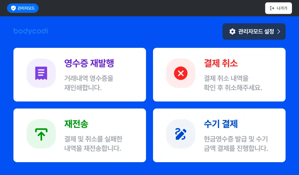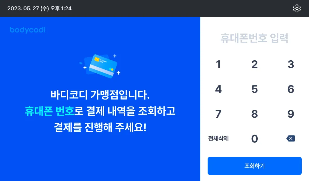 바디코디 전용 POS기 화면입니다. 오른쪽 상단에 톱니바퀴 버튼을 눌러주세요!