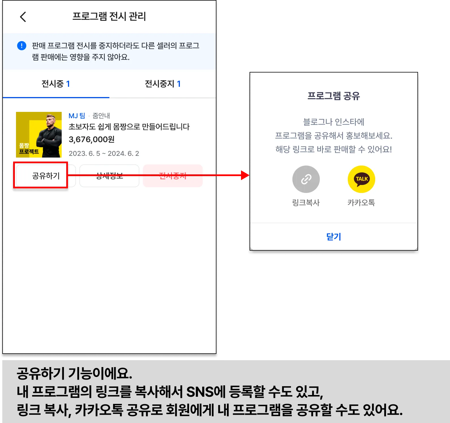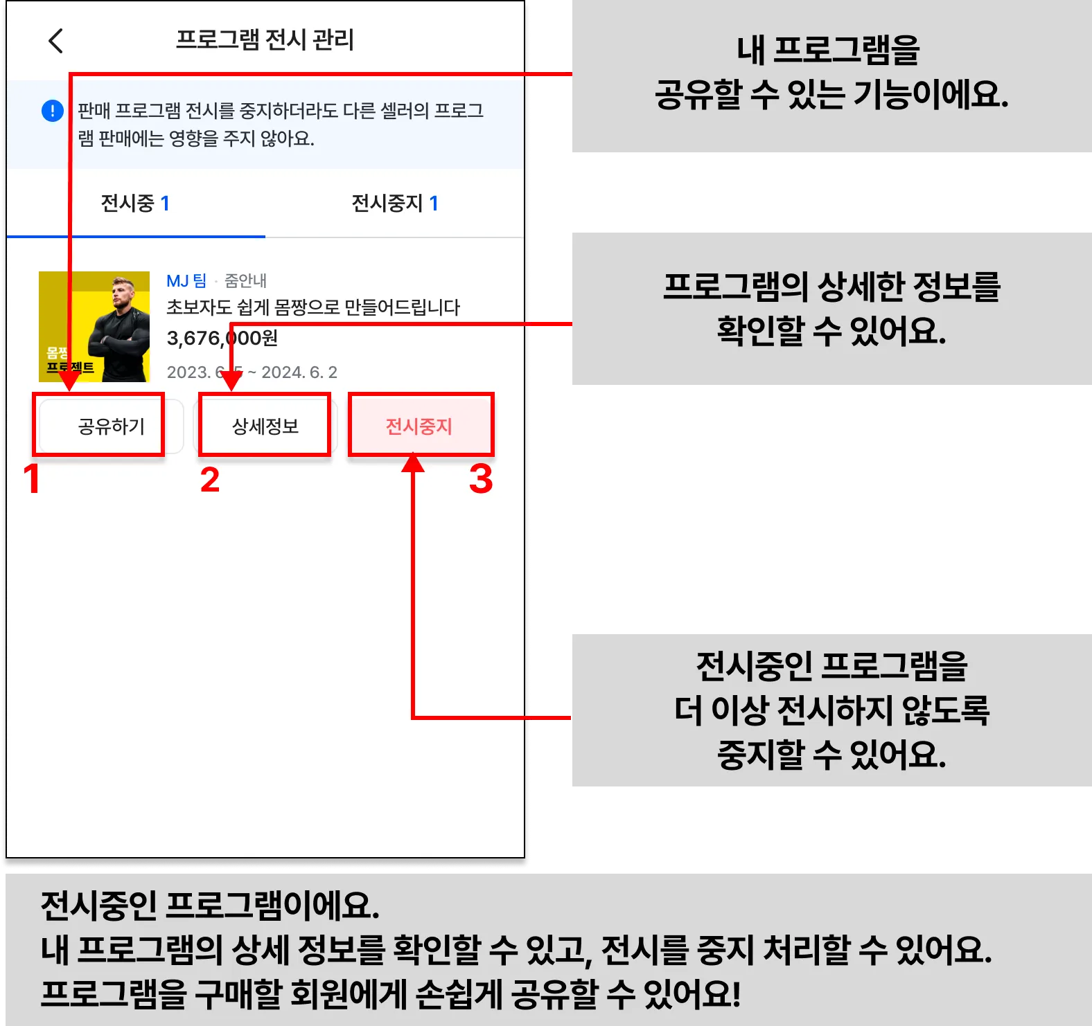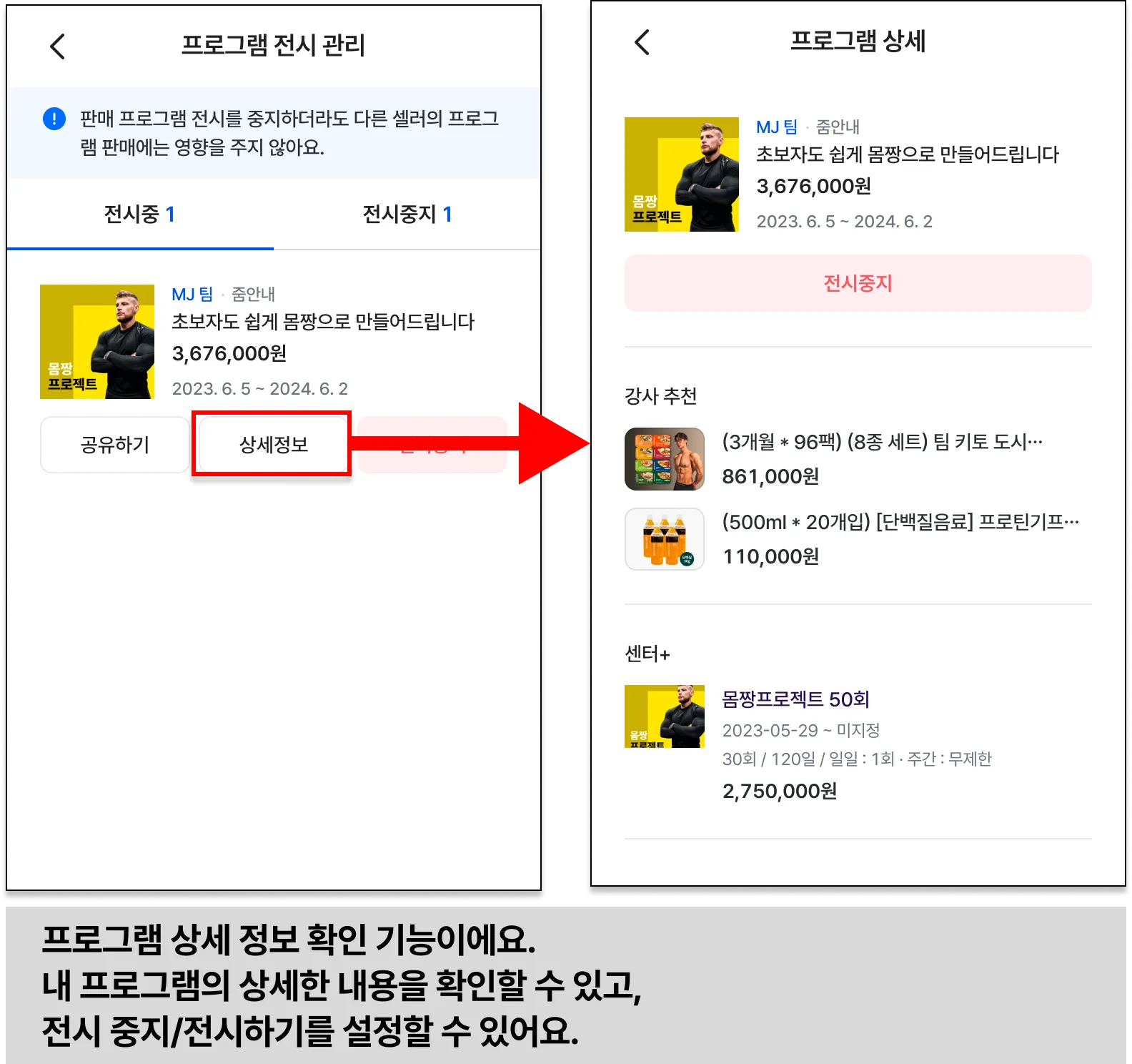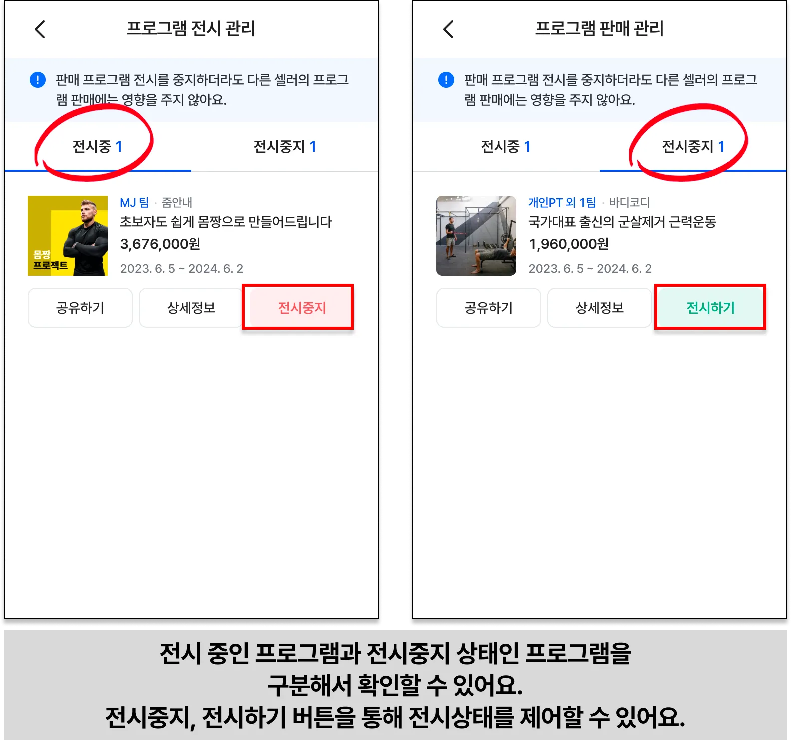 이제, 바디코디 플러스 관리에서 셀러가 자신의 프로그램 전시를 관리하는 방법을 알아볼게요.