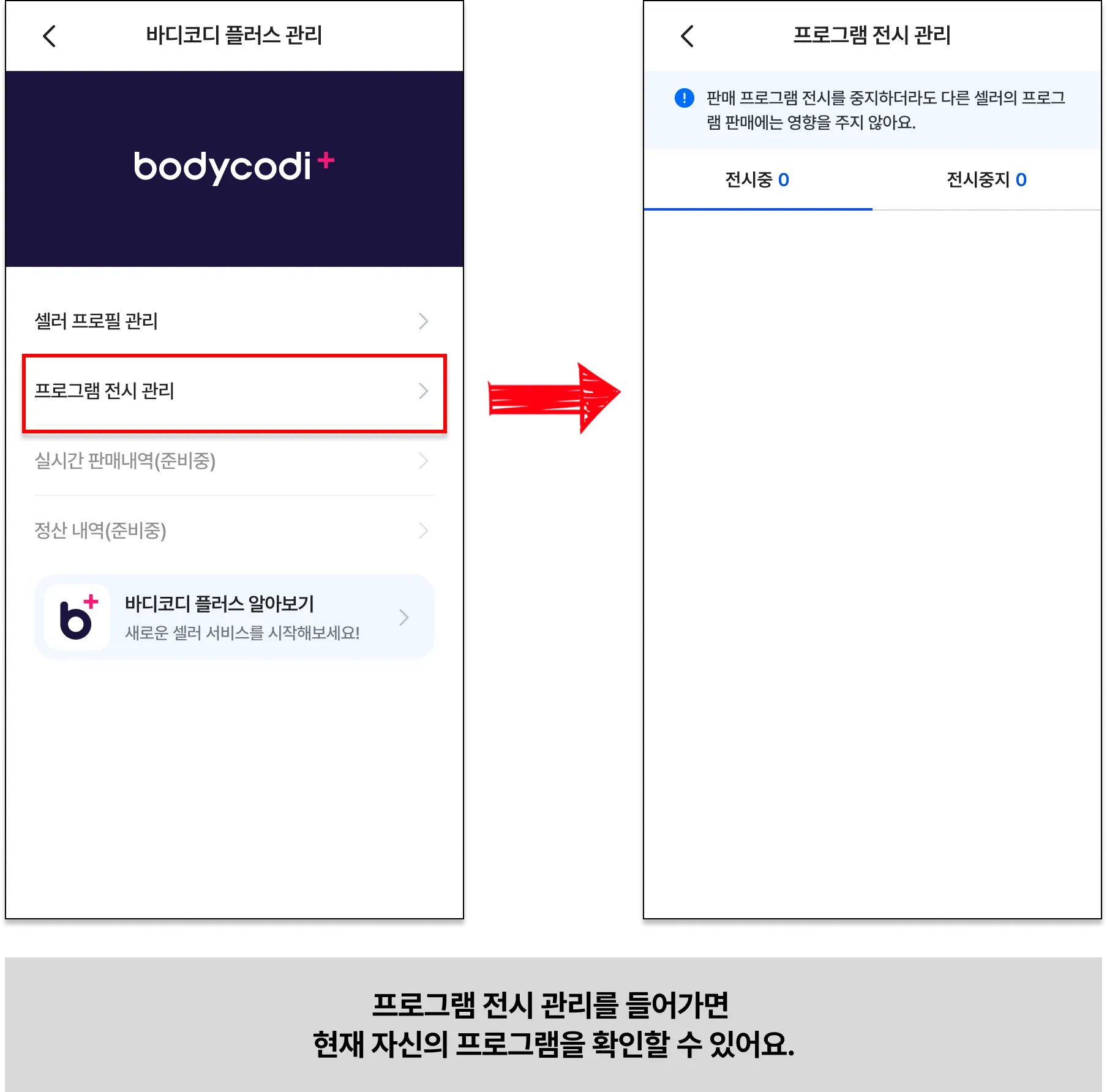 프로그램 전시 관리 기능은 모든 셀러가 아닌, 나만 해당 프로그램을 바디코디 플러스에 노출할지를 설정하는 기능이에요.