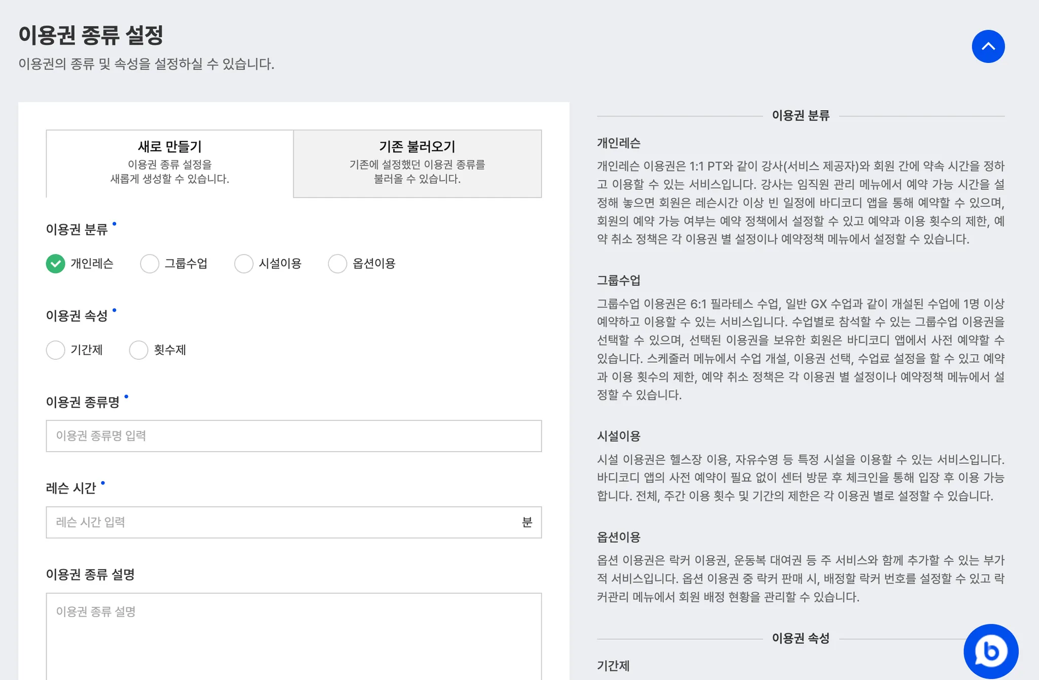 이용권 설정은 ‘기존 불러오기’ 기능을 통해 이전 만들었던 이용권의 정보를 사용할 수 있으며, 이전에 만들어 놓은 이용권이 없을 경우 ‘새로 만들기’를 통해 정보를 입력합니다.