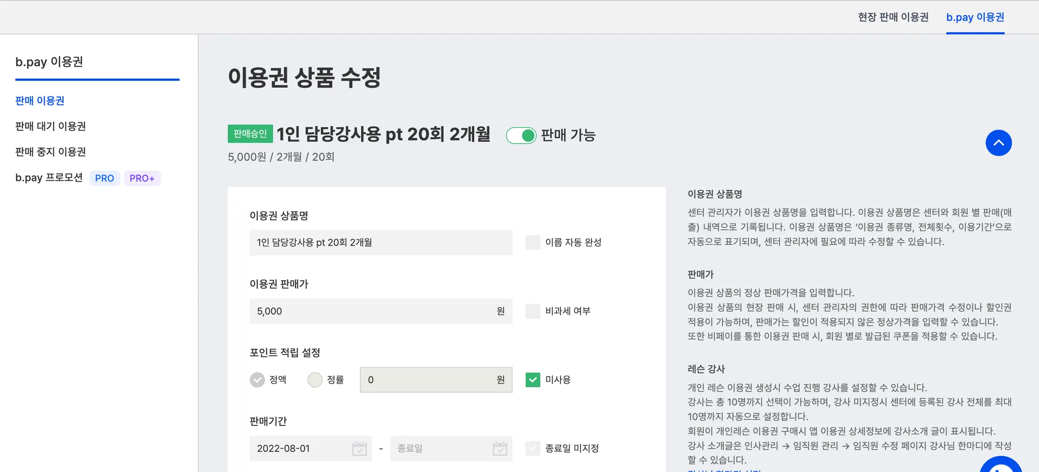 이용권 관리 > b.pay 이용권 > 판매 이용권에 들어가세요.