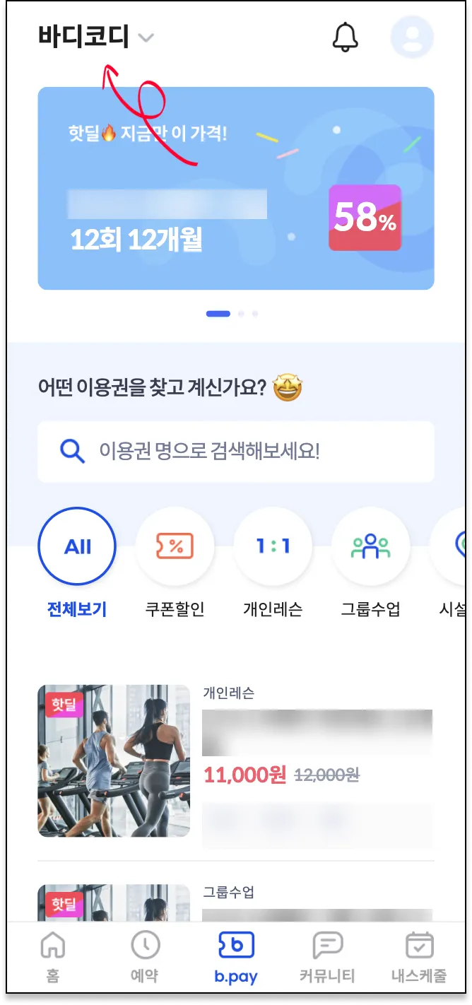 예약이나 b.pay탭의 최상단이 센터 선택에서 식단을 공유할 강사님이 있는 센터를 선택해주세요.