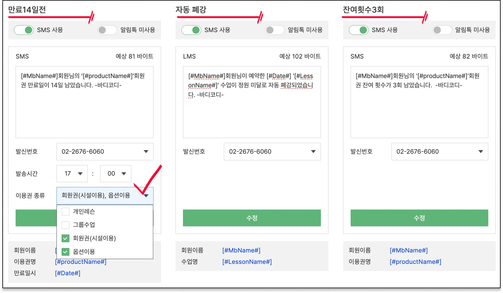 1. 자동문자 발송 템플릿 추가와 이용권 종류 옵션이 추가되었어요!