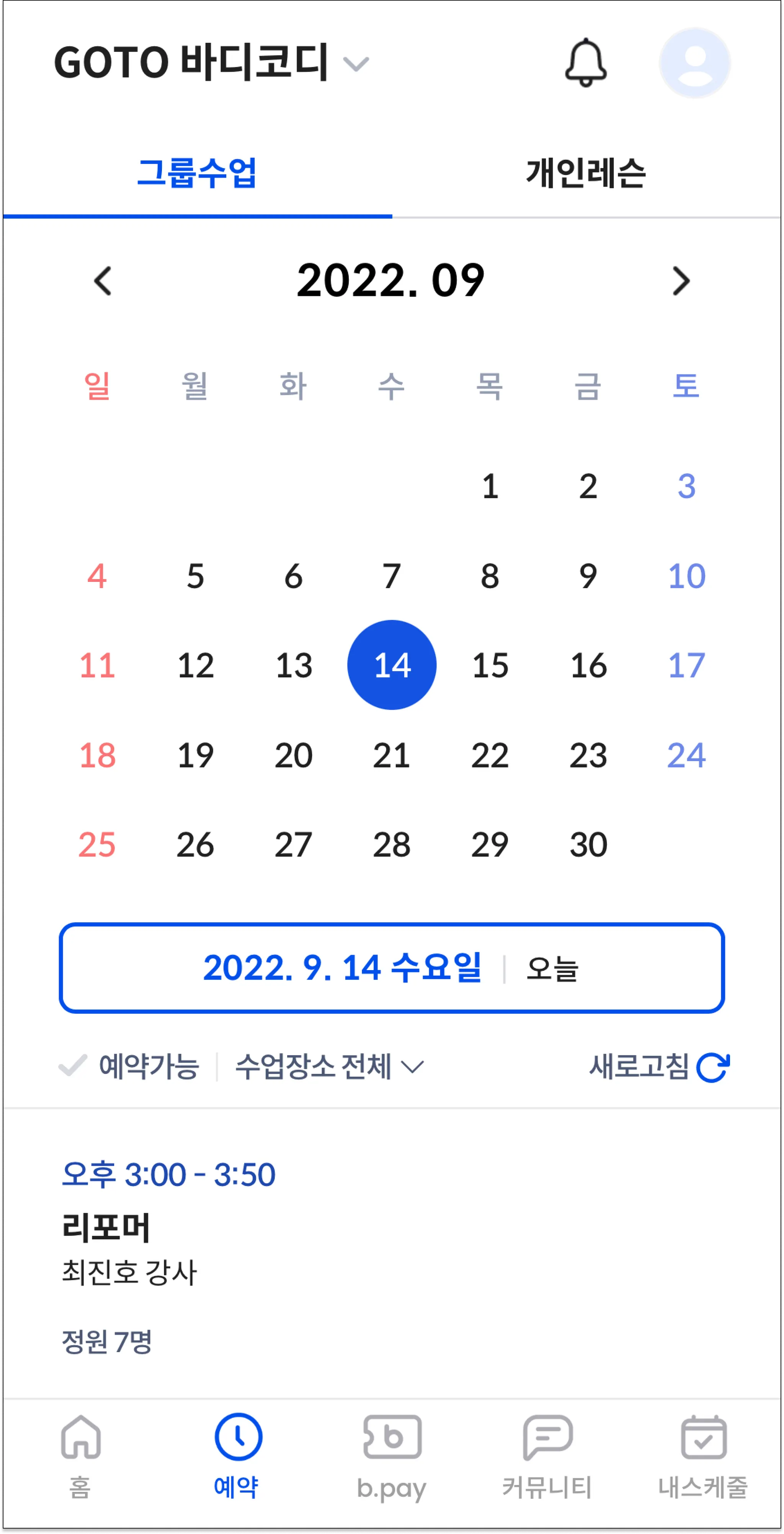 개인레슨처럼, 하단의 예약 메뉴를 눌러 수업 예약화면으로 이동하고, 달력에서 예약할 날짜를 선택해주세요.