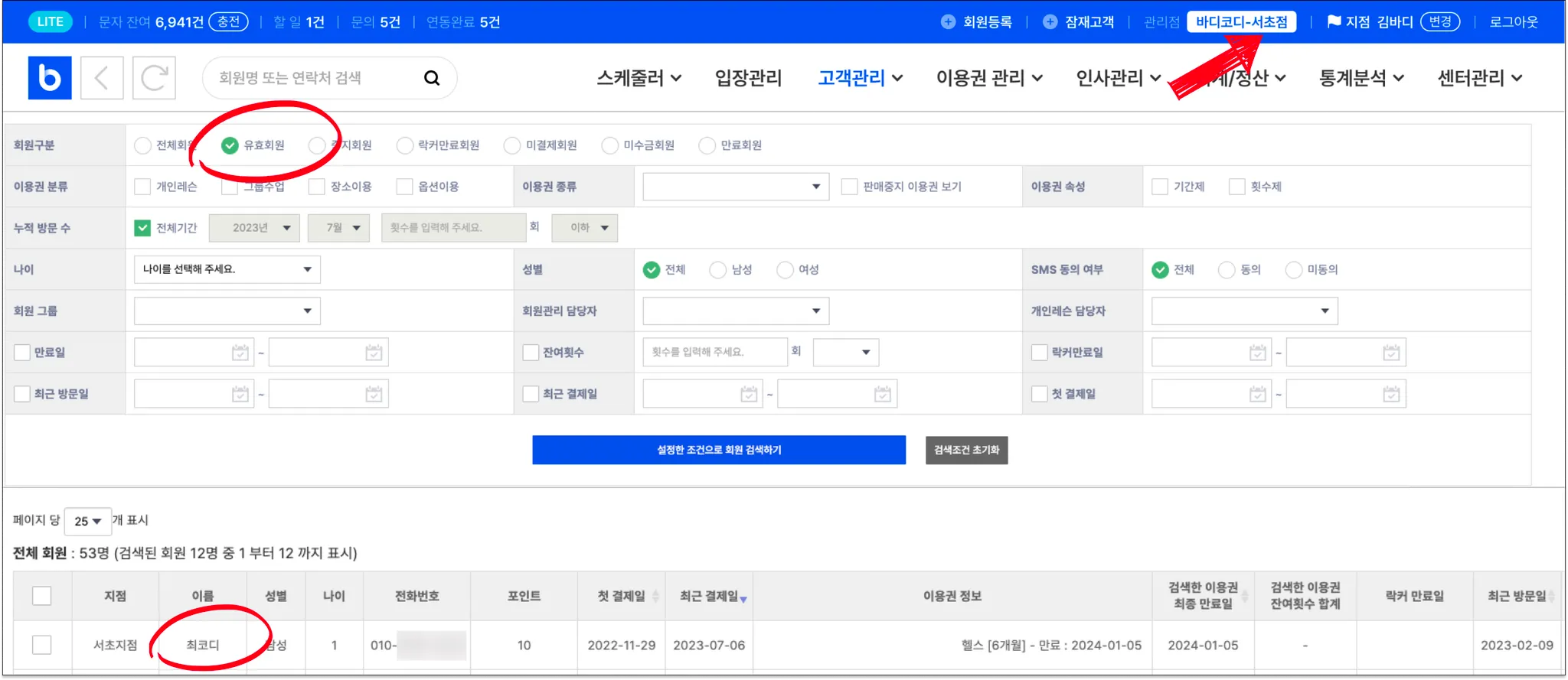 바디코디 서초점에서 최코디 회원은 ‘유효회원’으로 검색돼요.