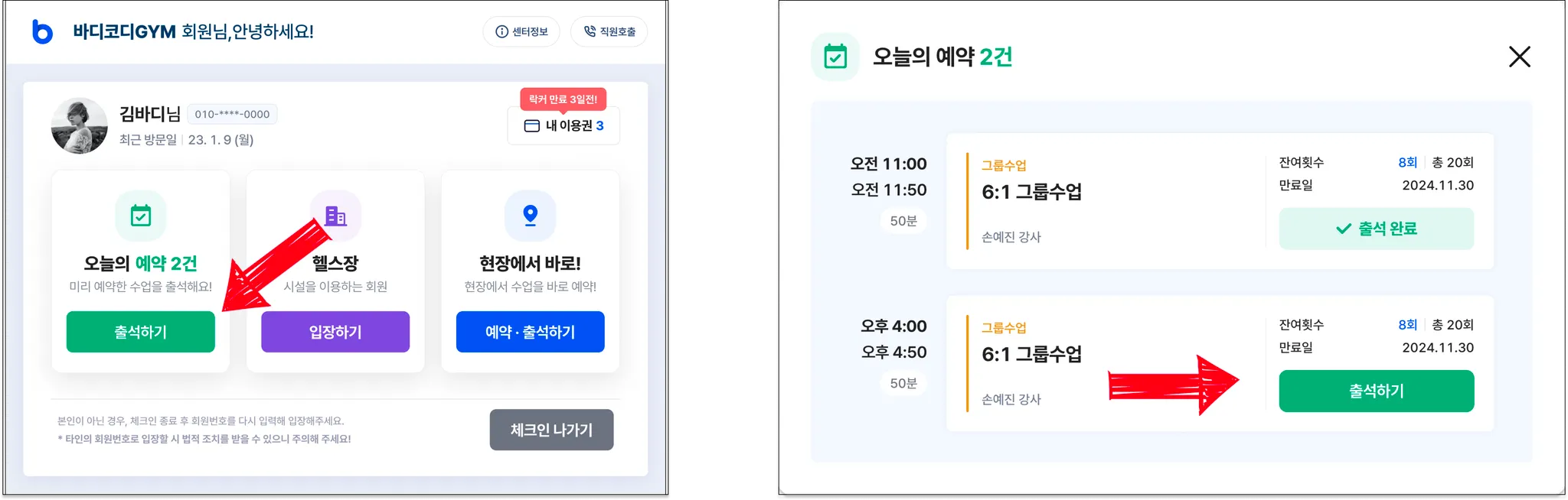 바디코디 체크인은 예약한 수업의 출석, 시설 출석 등을 다양한 방식으로 제공하고 있어요.