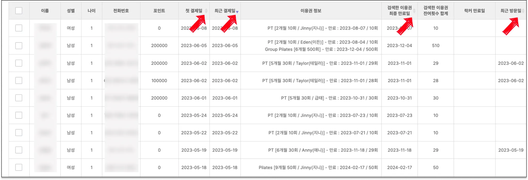 첫 결제일, 최근 결제일, 검색한 이용권 최종 만료일, 최근 방문일은 버튼으로 오름차순/내림차순으로 정렬할 수 있어요.