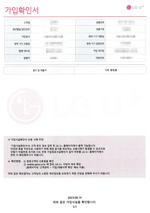 가입사실 확인서(AS 센터 제출용)는 홈페이지 또는 직영점(대리점)을 통해 발급받으실 수 있습니다.