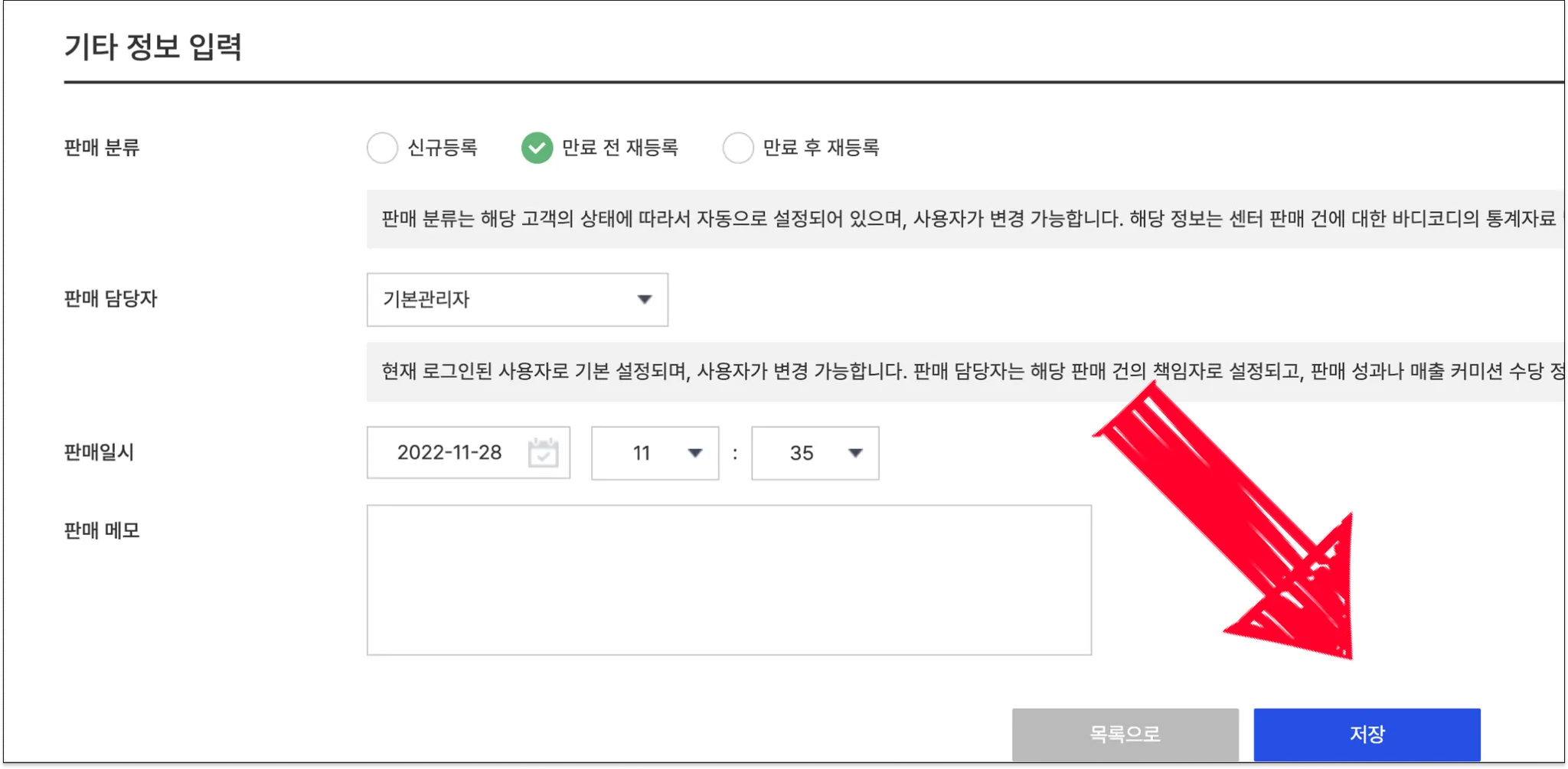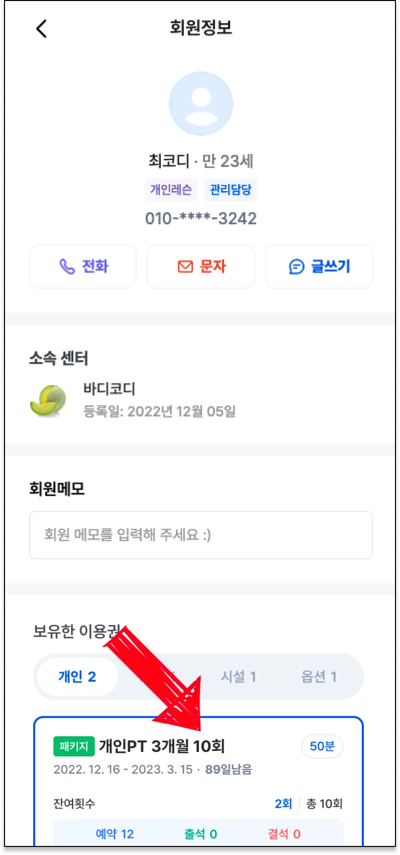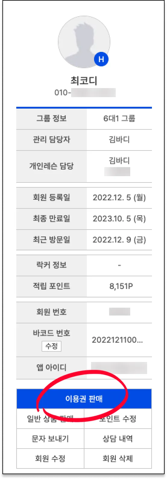 1) 회원 상세 정보에서 ‘이용권 판매’를 진행하세요.