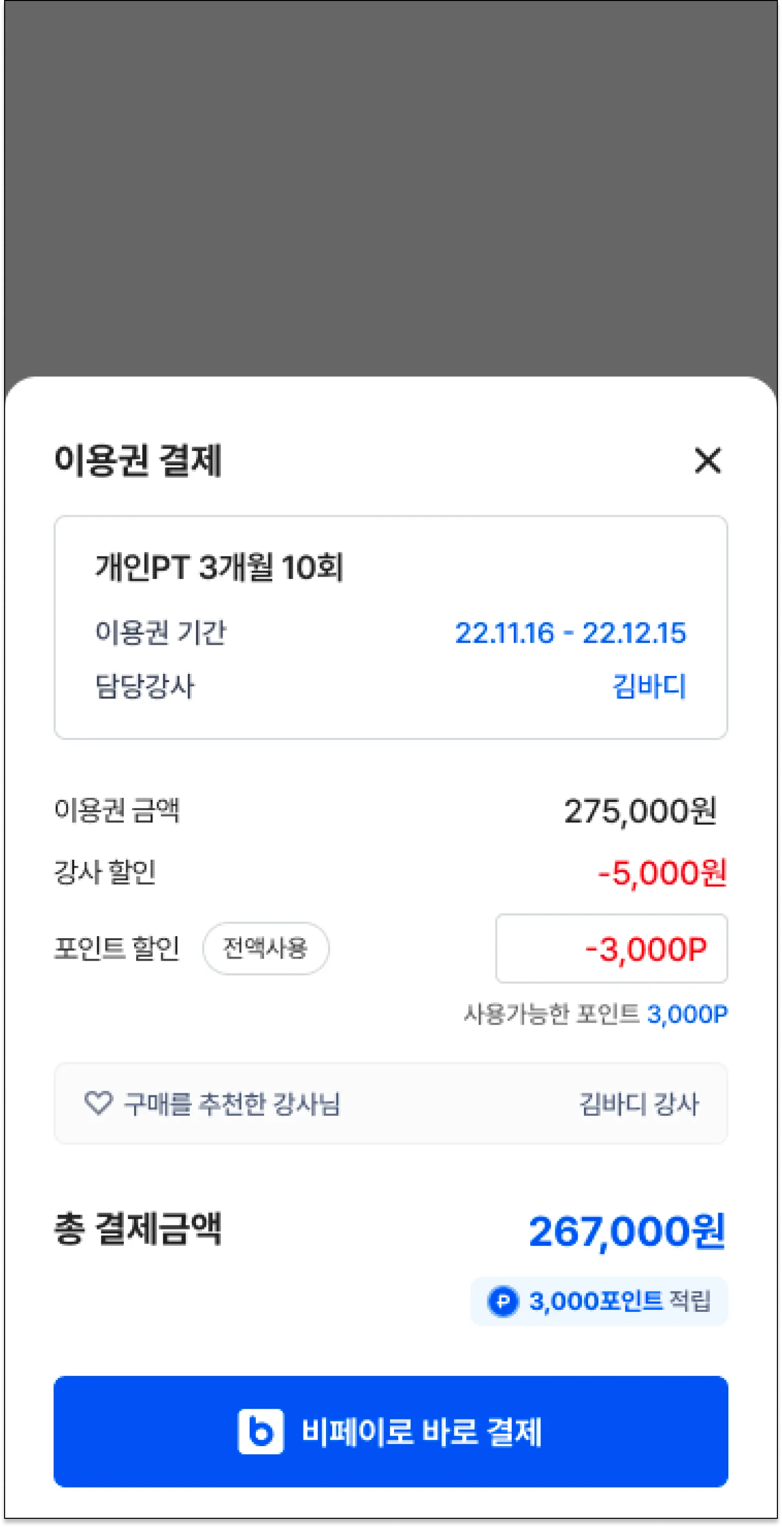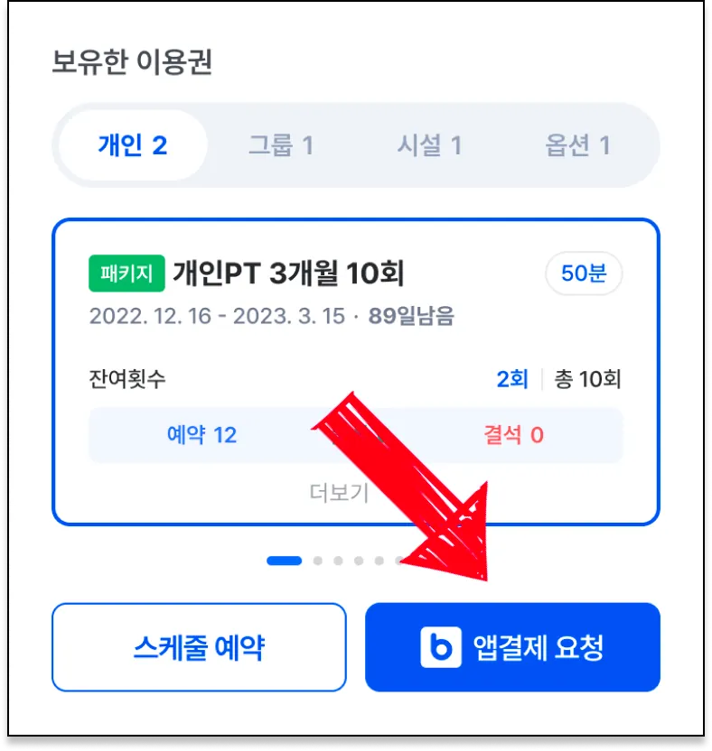 CRM과 강사앱에서, 회원앱으로 결제 요청을 보내 회원이 b.pay로 현장결제 이용권을 구매할 수 있는 기능이에요!