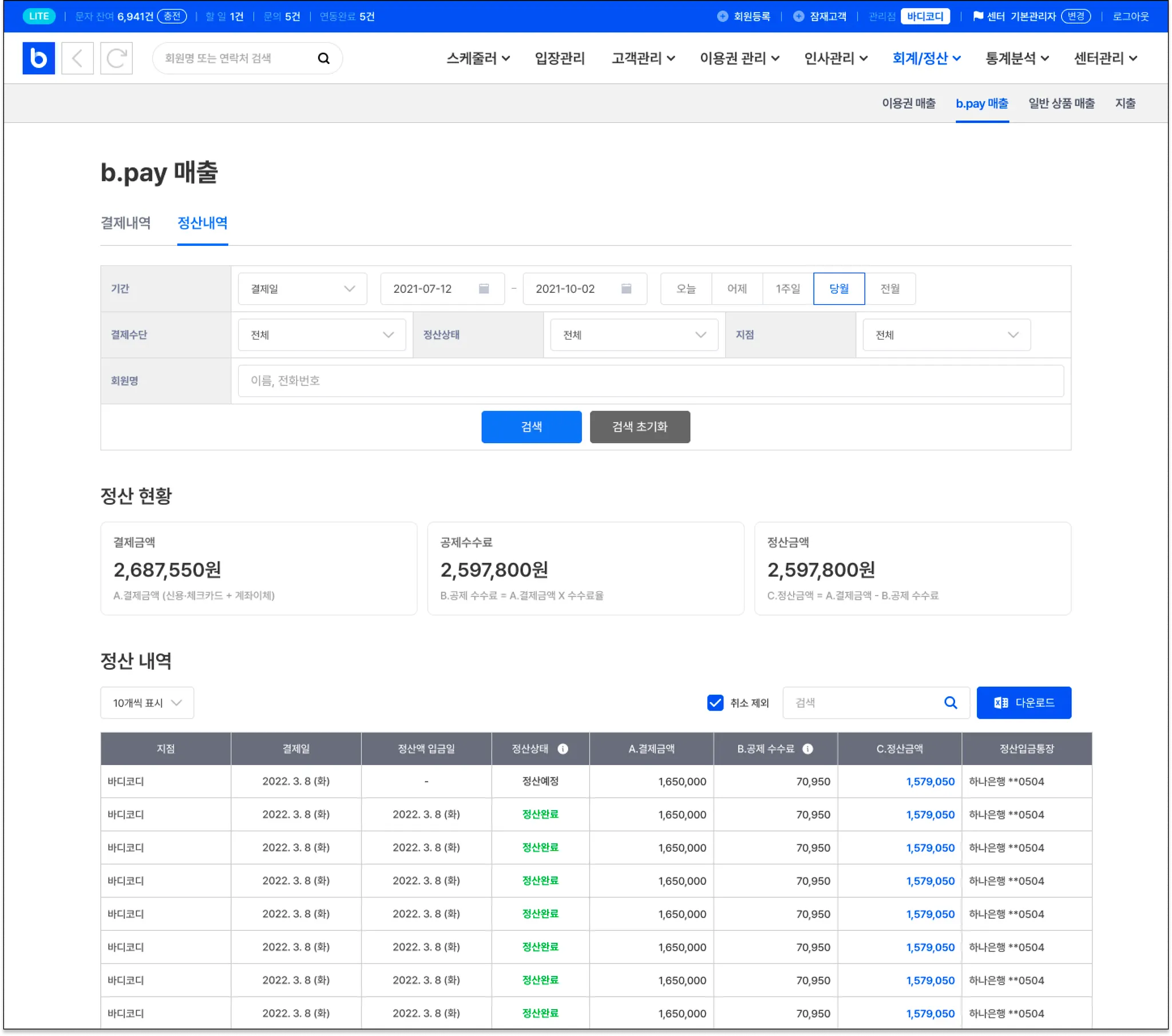 정산금은 CRM의 [회계관리] > b.pay 매출 조회에서 확인할 수 있어요.