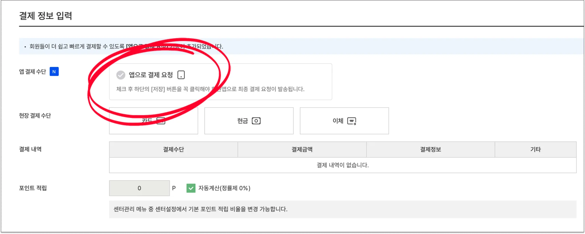 저장을 누르지 않으면 회원앱으로 결제 요청이 가지 않아요. 반드시 저장까지 해주세요!