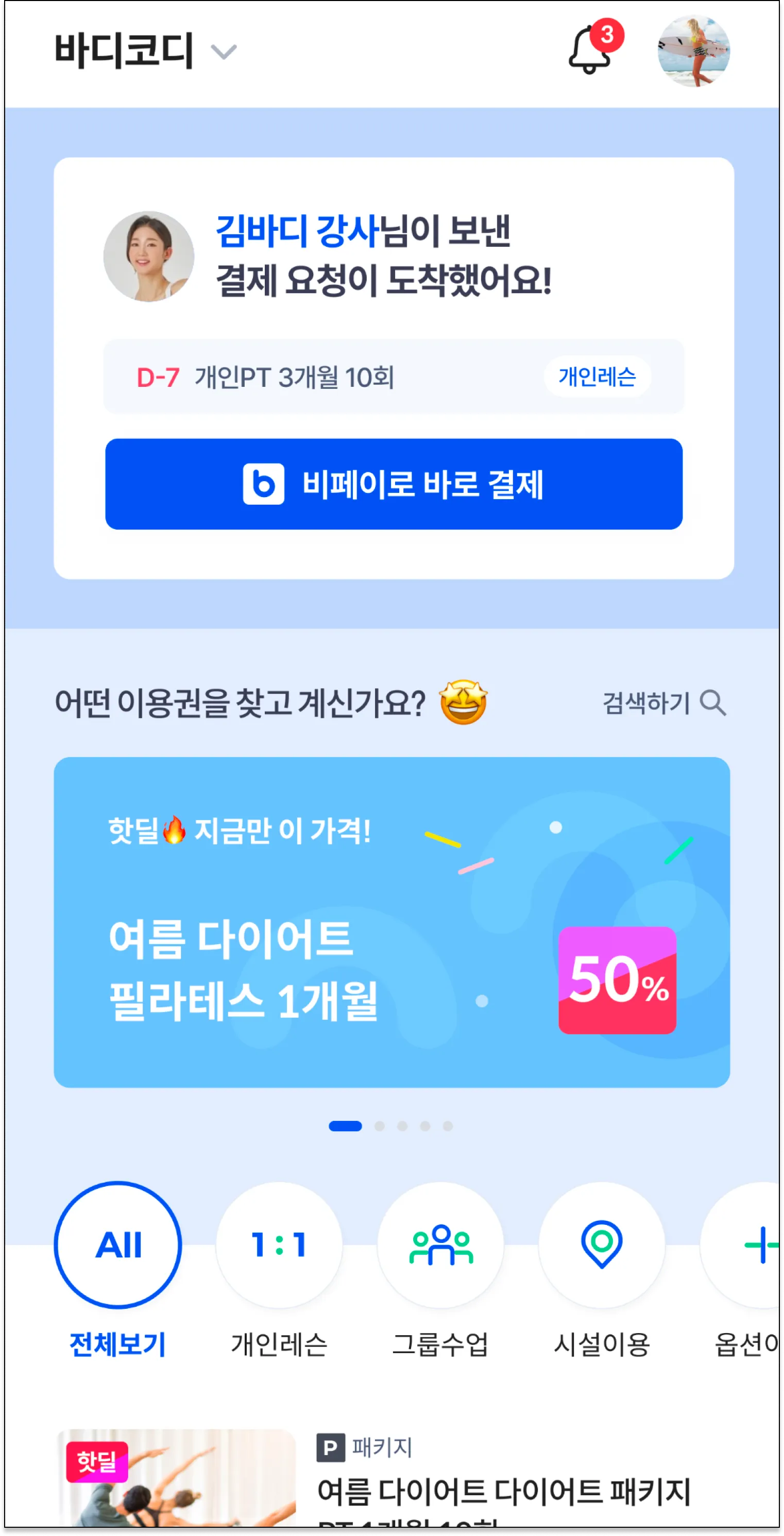 김바디 강사님이 보낸 결제 요청이 도착했어요! 비페이로 바로 결제를 누르면 이용권을 결제할 수 있어요.