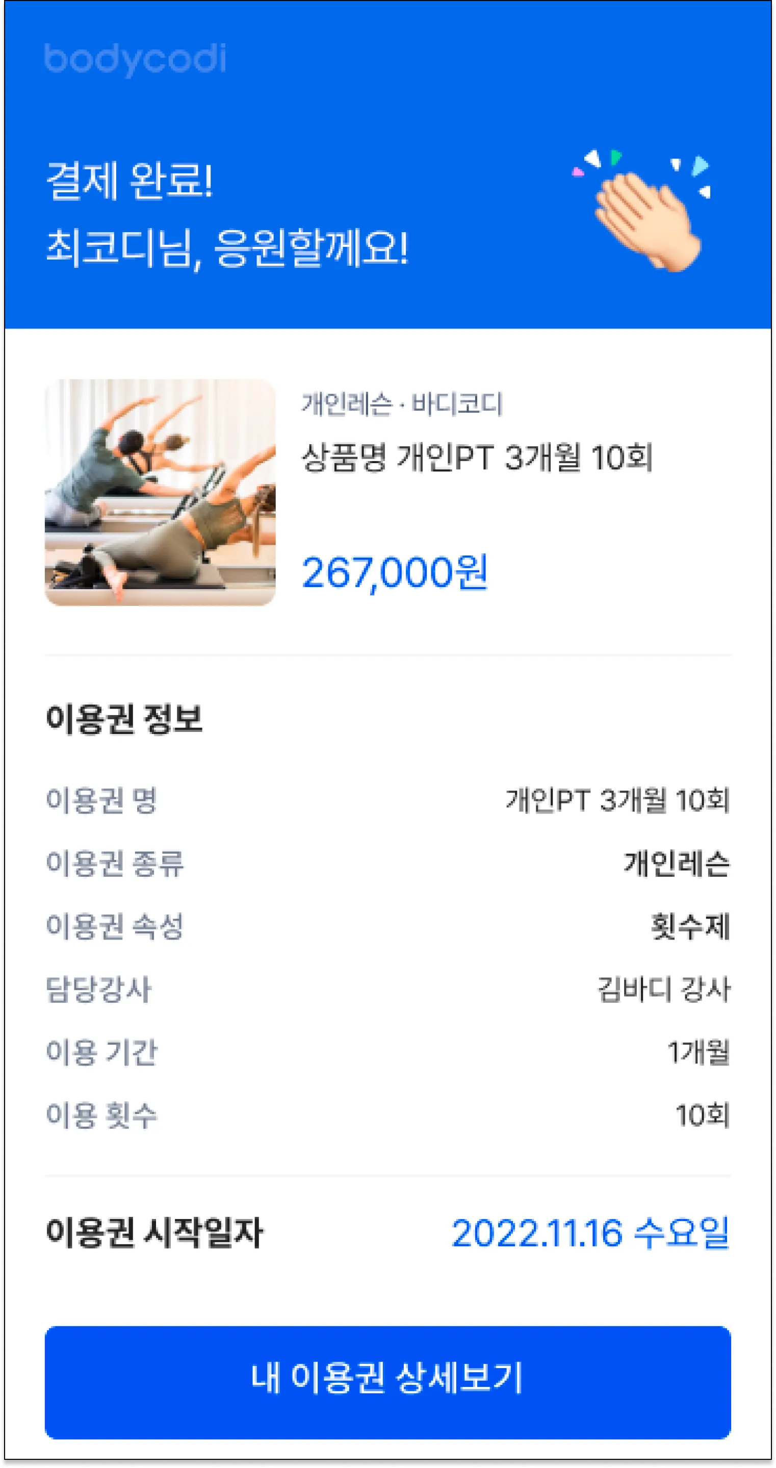 이용권 종류와 상관없이 개인레슨, 그룹수업, 시설이용, 옵션 모두 결제 요청이 가능합니다.