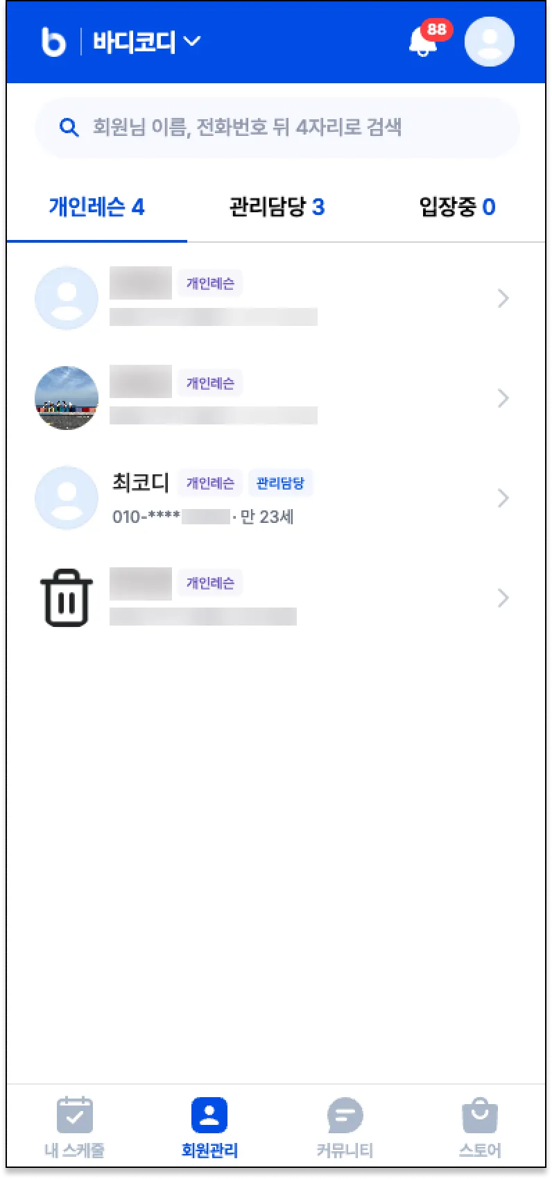 회원관리에서 개인레슨 회원이나, 관리담당 회원을 선택해주세요.