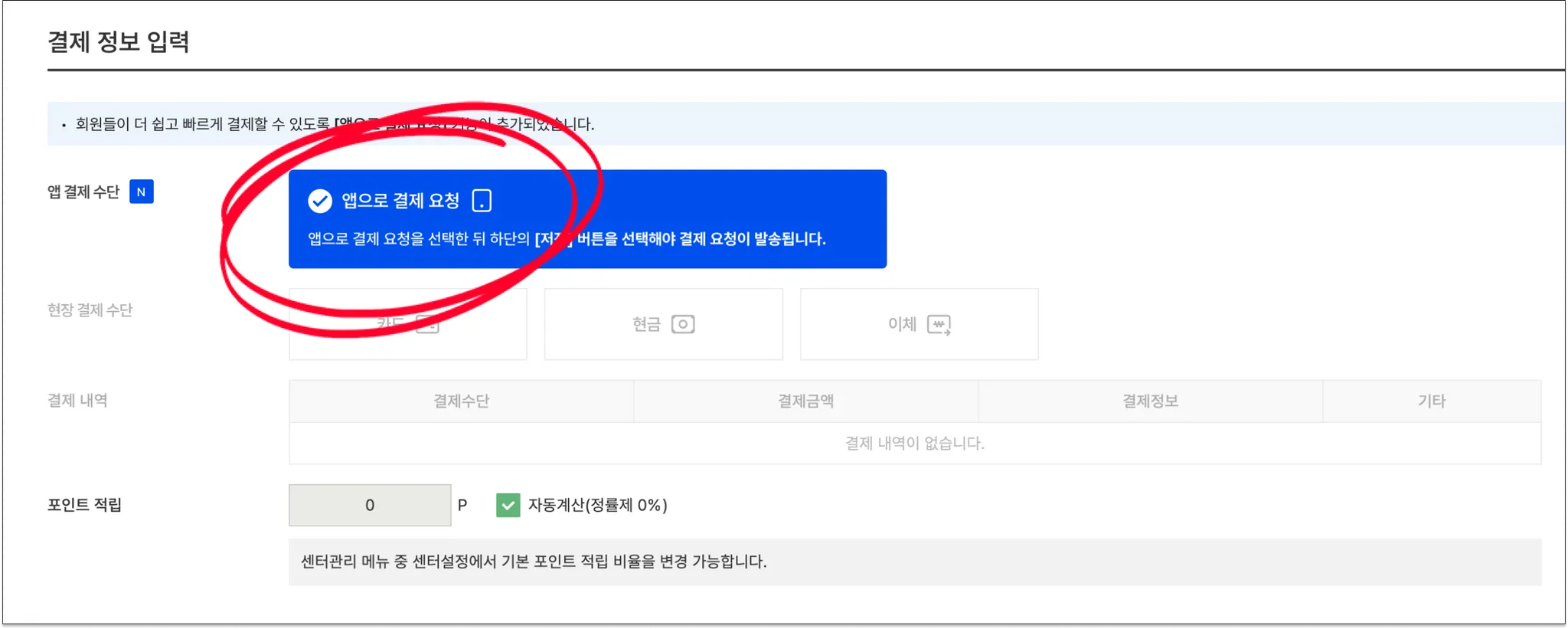 앱으로 결제 요청을 선택해야 회원앱으로 결제를 요청할 수 있어요!