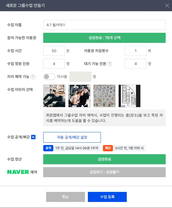 5) 수업이미지 선택 : 그룹수업 예약 시 회원앱에서 보여지는 이미지 선택 바랍니다. 수업이미지는 센터관리 > 센터설정 > 그룹수업 이미지등록에서 등록 바랍니다.