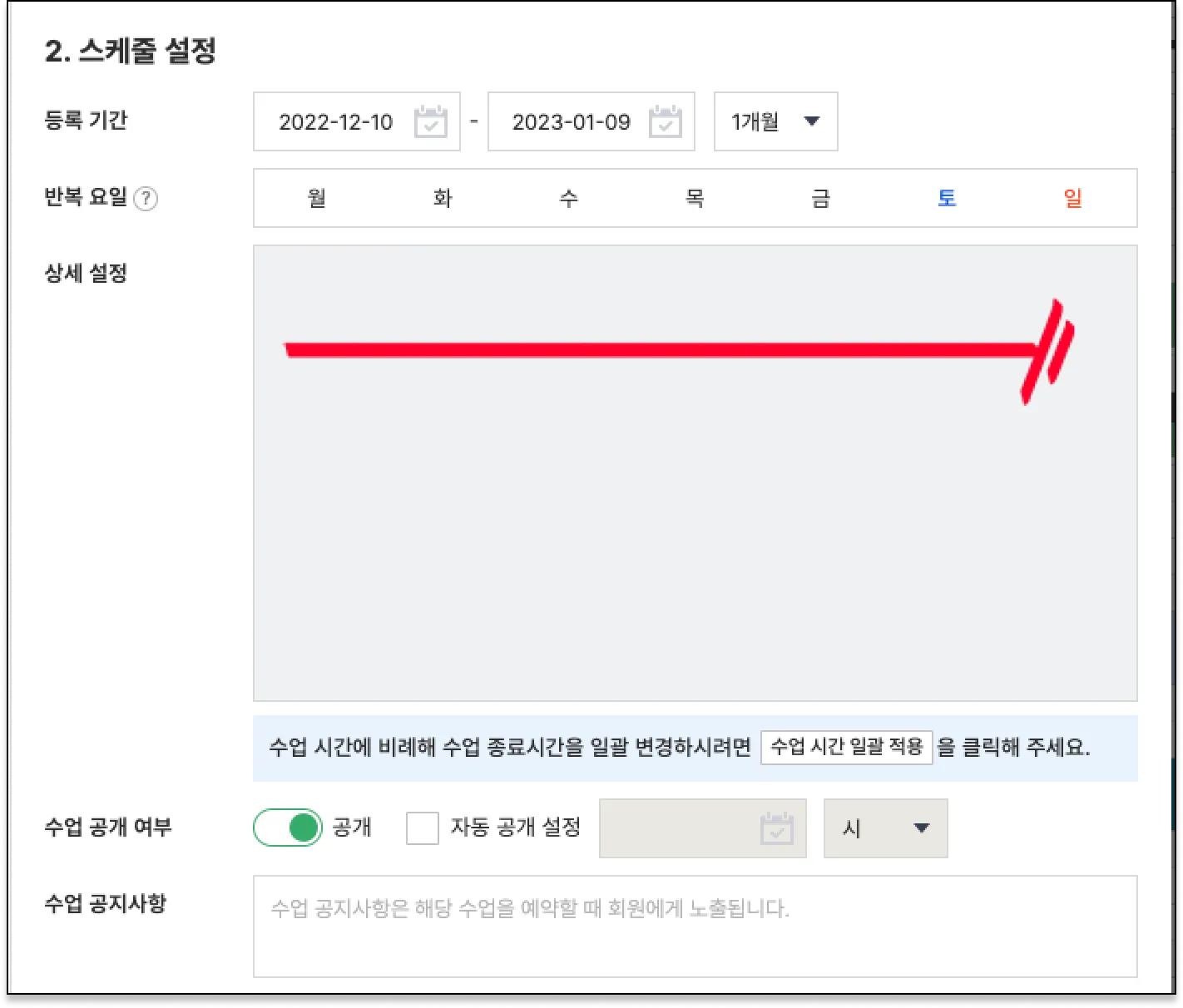 방법1) 스케줄러 > 그룹수업스케줄 > 수업클릭 > 수업수정 > 수업자동공개설정 (수업 공개여부를 미공개로 해주셔야 설정 가능합니다.)