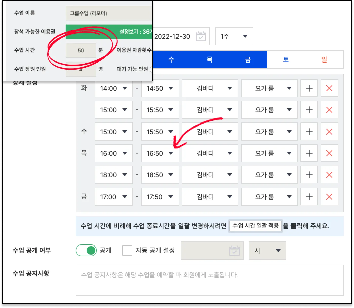 4) 종료시간을 수업 시간에 맞게 일괄 설정하기