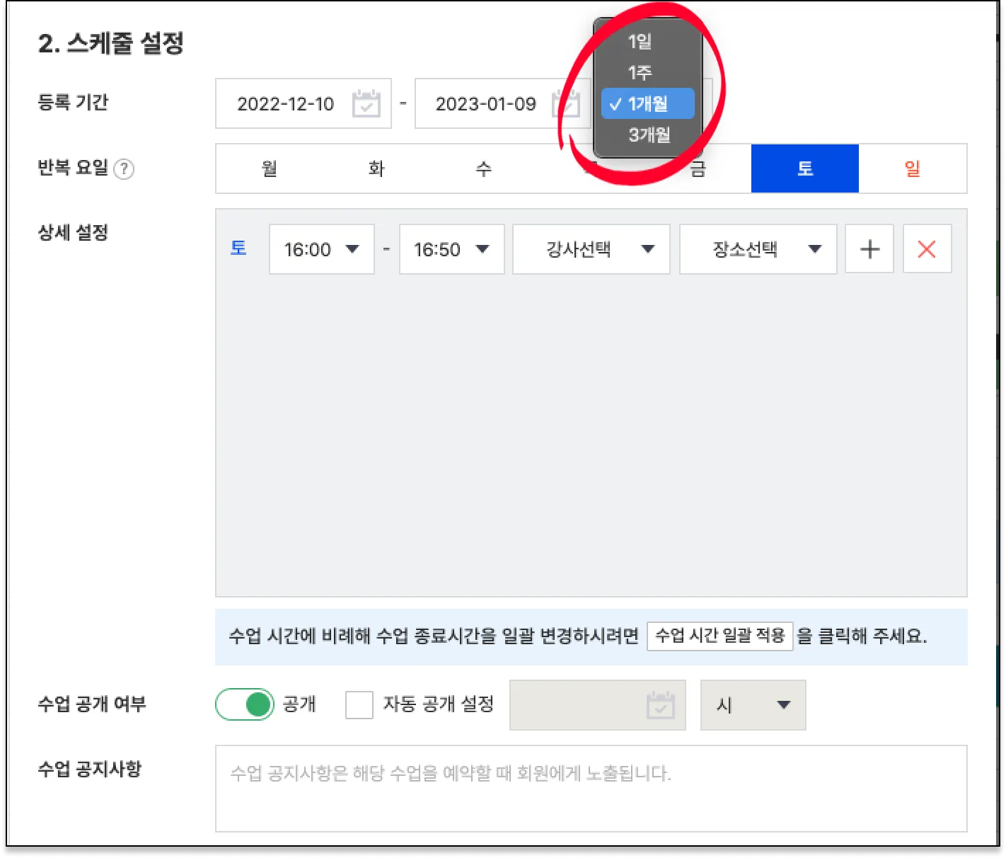 요일을 선택하고, 상세 설정에서 스케줄 시간, 강사, 장소를 각각 선택하여 스케줄을 추가할 수 있어요!