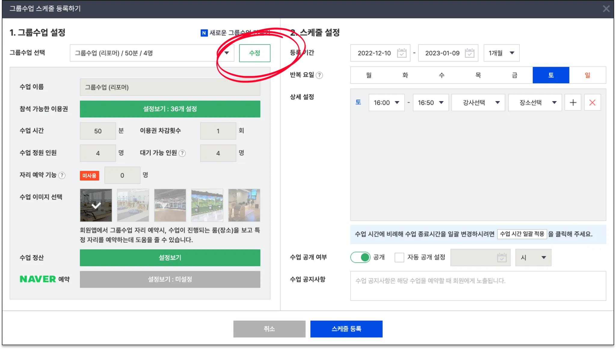 방법2) 스케줄러 > 그룹수업스케줄 > 일괄변경/취소 > 수업공개설정