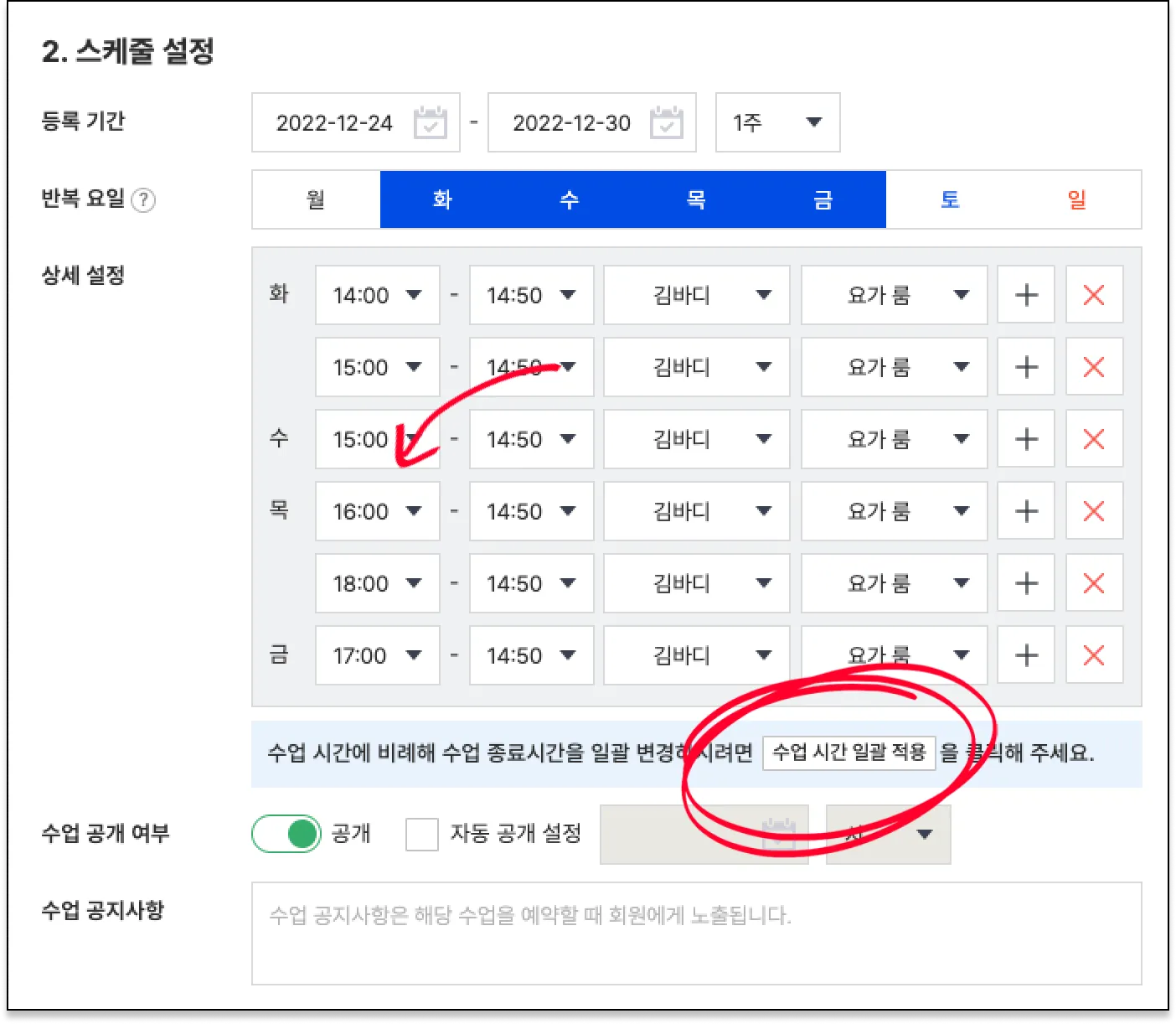 우선, 스케줄의 시작 시간을 설정해주세요. 그리고, 아래 ‘수업 시간 일괄 적용’ 버튼을 누르면 스케줄 시작 시간에 맞춰 종료시간이 자동으로 적용돼요.