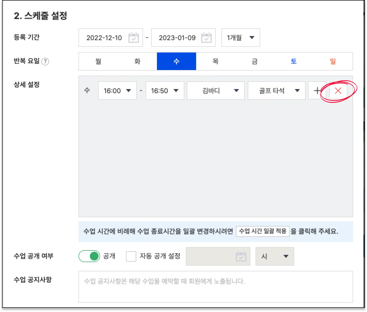주의! 해당 요일의 모든 스케줄이 삭제되요. 하나의 스케줄만 삭제하고 싶으면 x 버튼을 눌러 삭제해주세요.