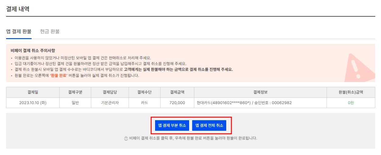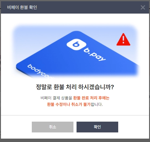 (주의! 현금환불 처리 시 b.pay취소는 불가합니다. 실제로 현금환불을 하지 않았다면, 클릭하지 말아주세요.)