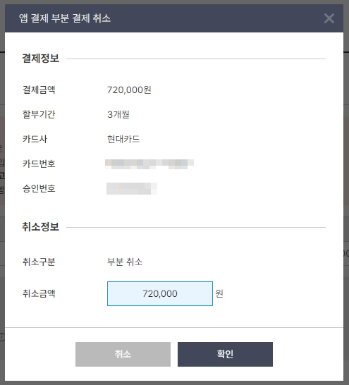 4. 부분취소 : 취소할 금액 기입 / 전체취소 : 금액이 올바른지 확인