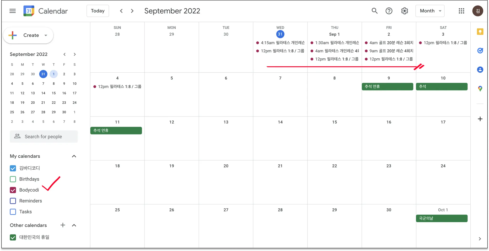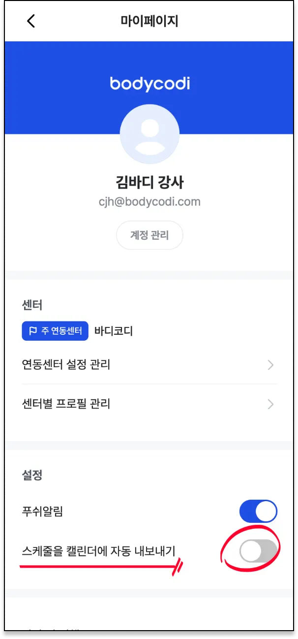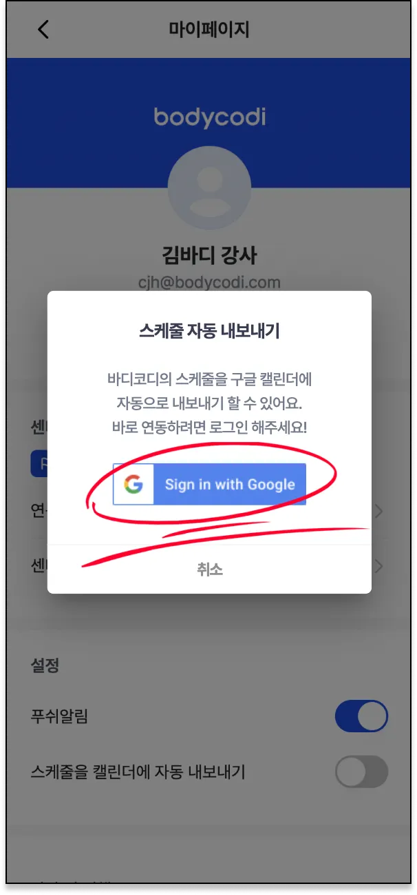 바디코디 강사앱에 등록된 스케줄을 구글캘린더에 내보내서, 구글캘린더에서 강사앱 스케줄을 확인할 수 있는 기능입니다.