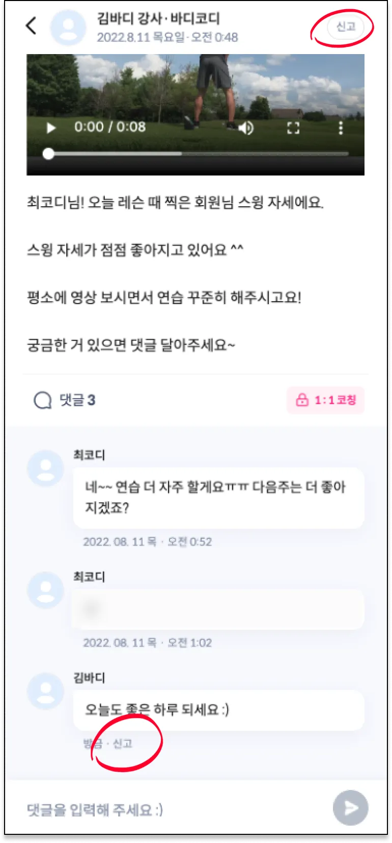 변경된 정책을 대응하기 위해 바디코디는 커뮤니티 게시글과 댓글을 신고할 수 있는 기능을 추가했습니다.