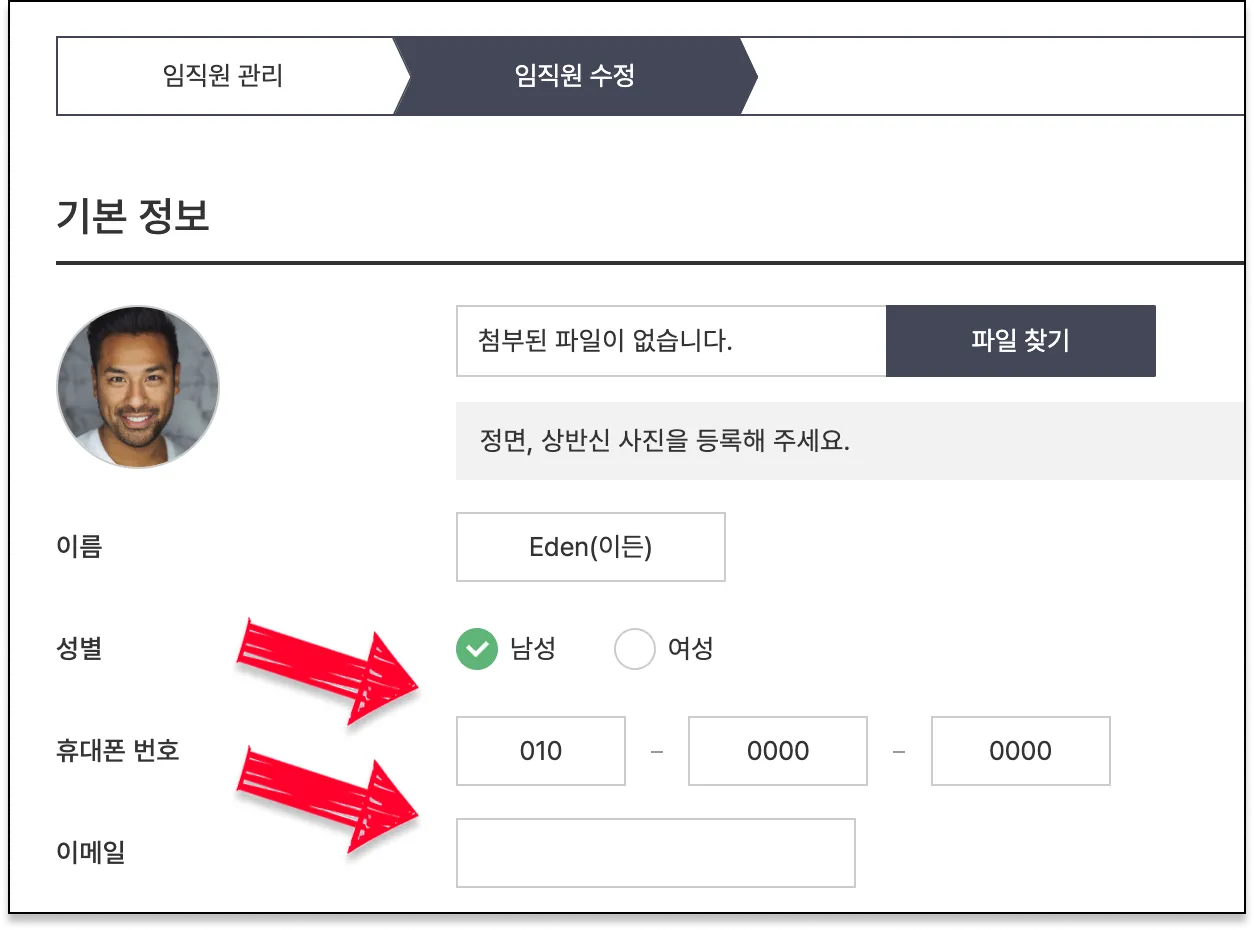 바디코디 프로그램 > 임직원 관리 > 대표관리자 > 수정 > 전화번호 및 이메일 주소 확인