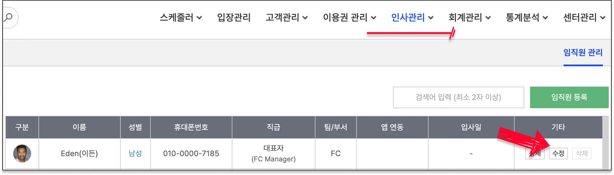 인사관리 > 임직원 관리 > 대표관리자를 선택 후, 수정을 눌러주세요