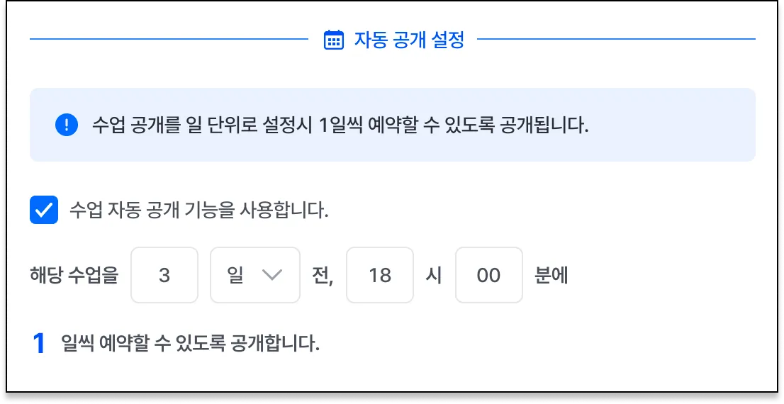 수업을 3일 전, 18시 00분에 1일씩 예약할 수 있도록 공개합니다. 라는 설정을 추가해봤어요.