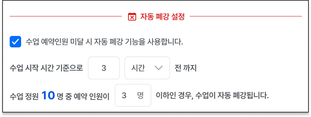 예시로, 수업 시작 시간 기준으로 3시간 전까지, 예약 인원이 3명 이하인 경우 수업이 자동 폐강됩니다. 라는 설정을 추가할 수 있습니다.
