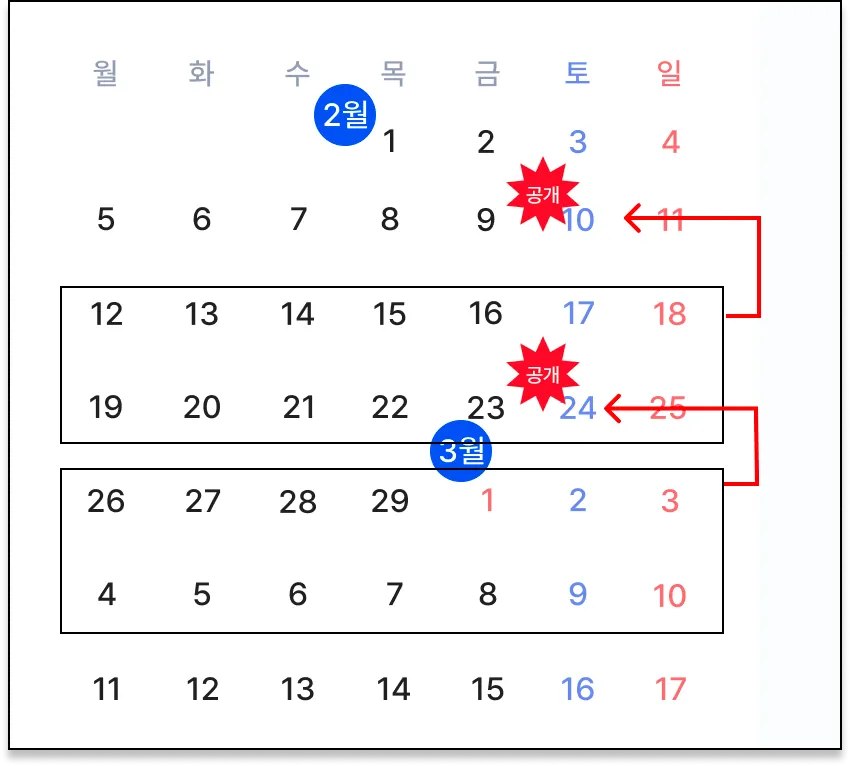2월 26일부터 2주 기간인 3월 10일까지의 수업은 2월 24일 금요일 18시00분에 회원들이 예약할 수 있게 공개돼요.