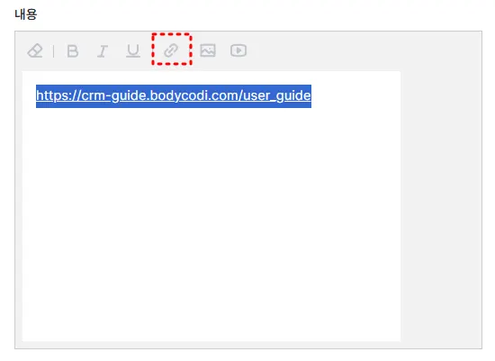원하시는 링크를 삽입 후 링크를 드래그 하여, 링크 버튼을 눌러주세요! 파란색 텍스트로 변경됩니다.