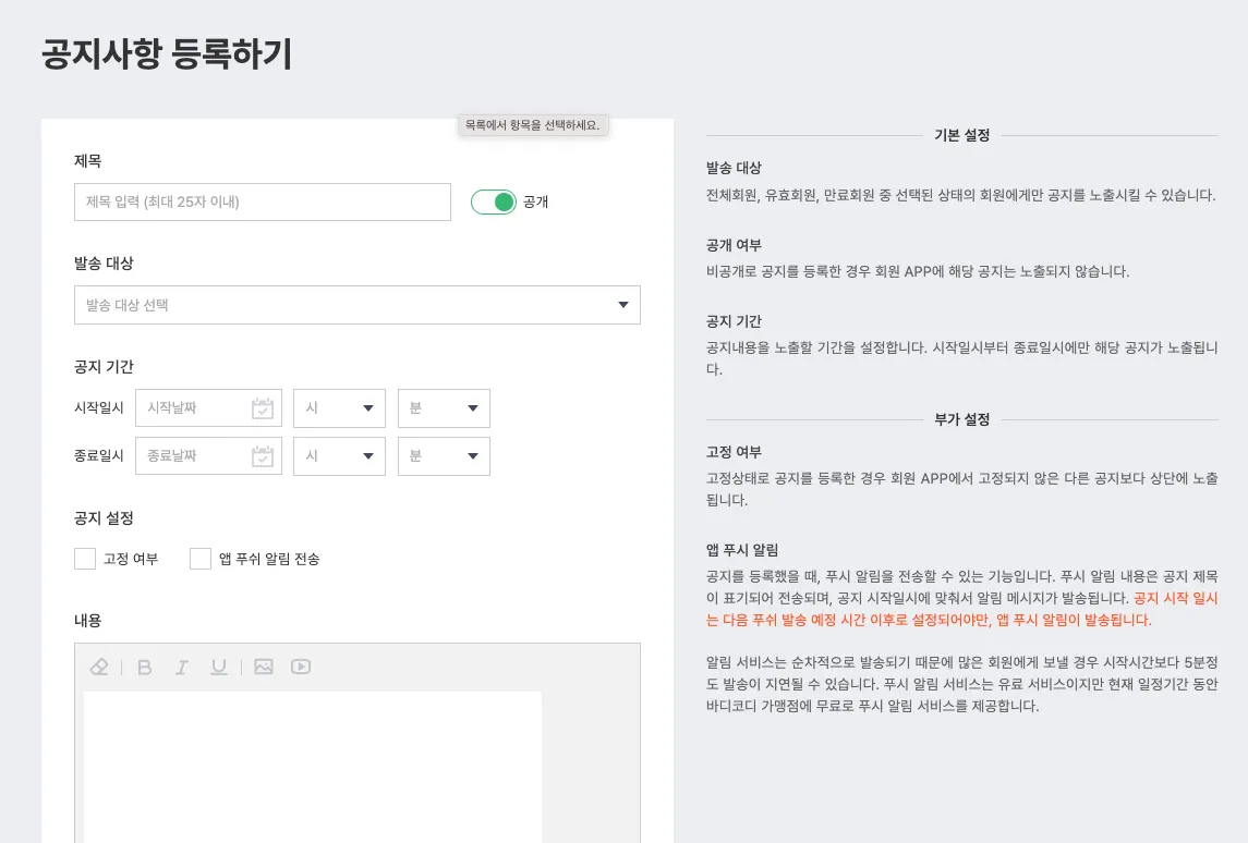 '앱푸쉬알림전송'에 체크를 하면 공지사항을 등록 시 회원앱으로 푸쉬 알림이 갑니다.