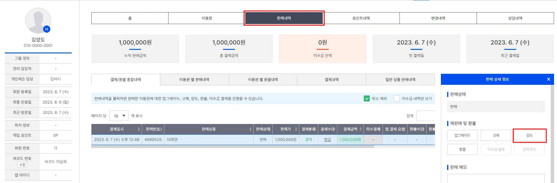 회원검색 > 판매내역 > 양도할 이용권을 선택해주세요.
