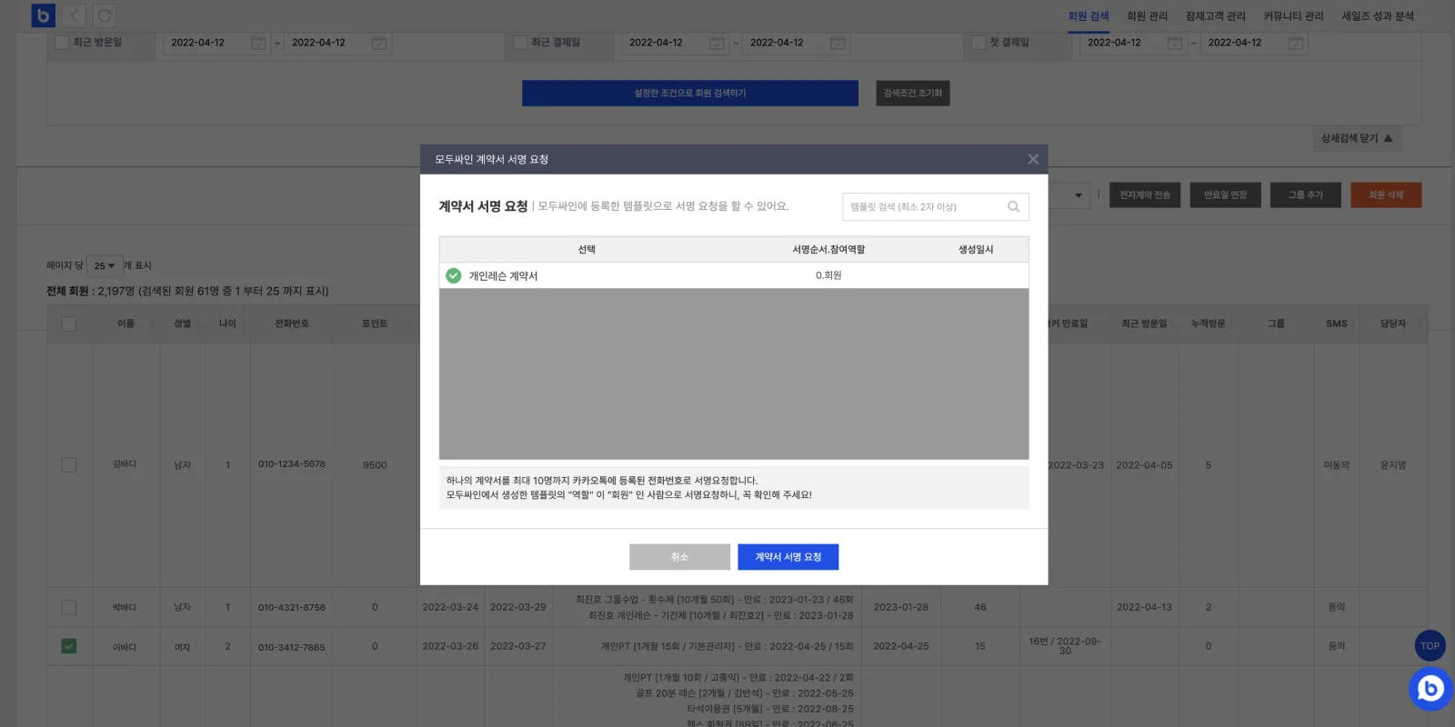 이제 언제든, 바디코디를 사용할 때, 고객관리 > 회원검색 에서 회원들을 선택(동시 10명까지)하고 전자계약을 전송할 수 있습니다.