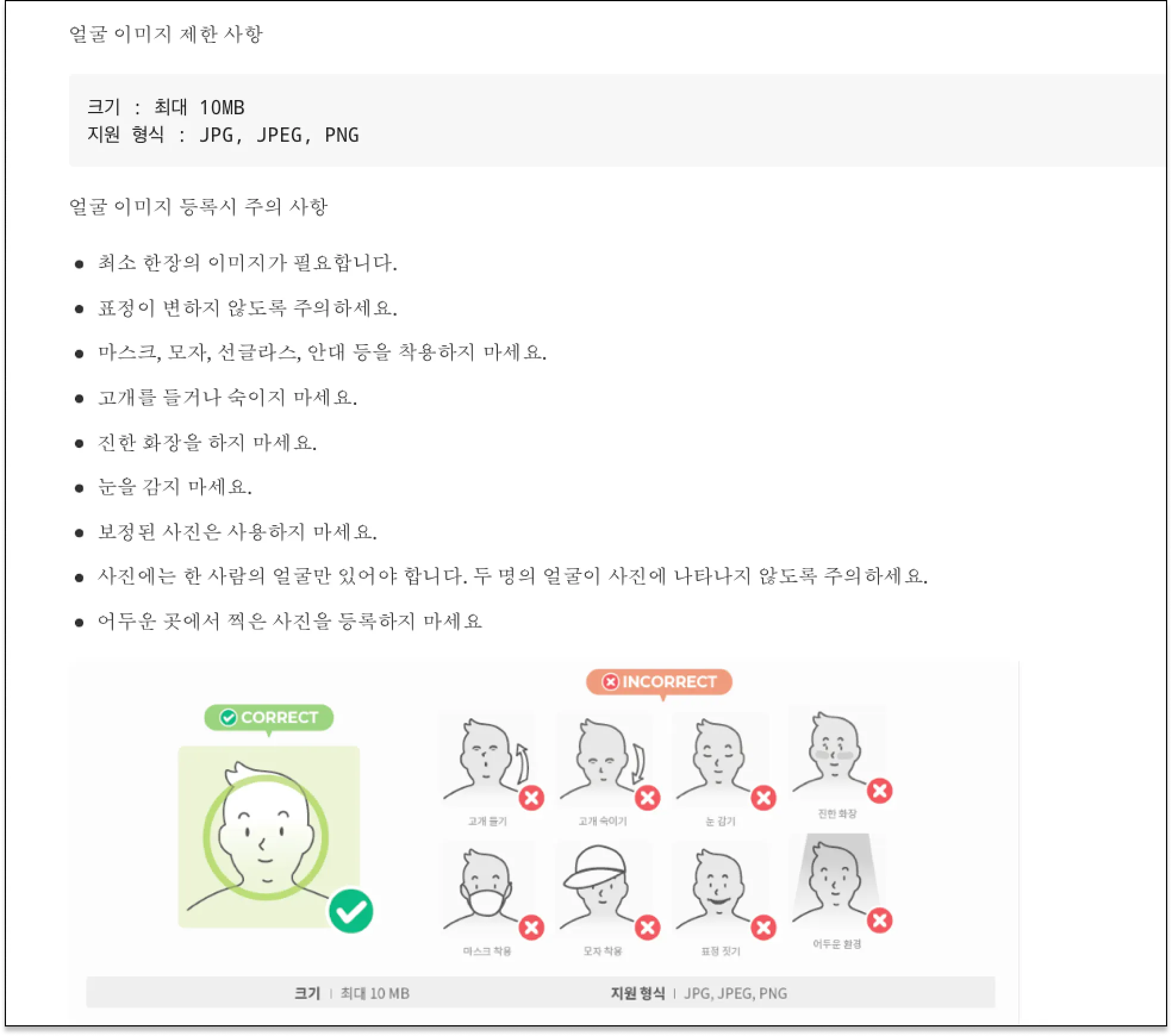 촬영 시 꼭 얼굴 위주로 사진을 촬영해주세요. 멀리 떨어져 있거나, 상반신 위주로 촬영 시 얼굴 등록에 실패할 수 있어요.