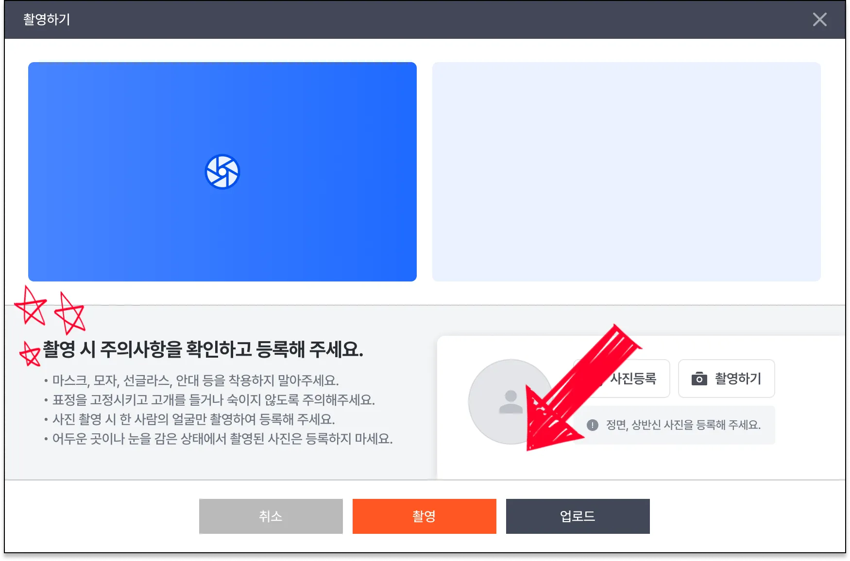 얼굴 정면 위주로 촬영한 후, 업로드해주세요!