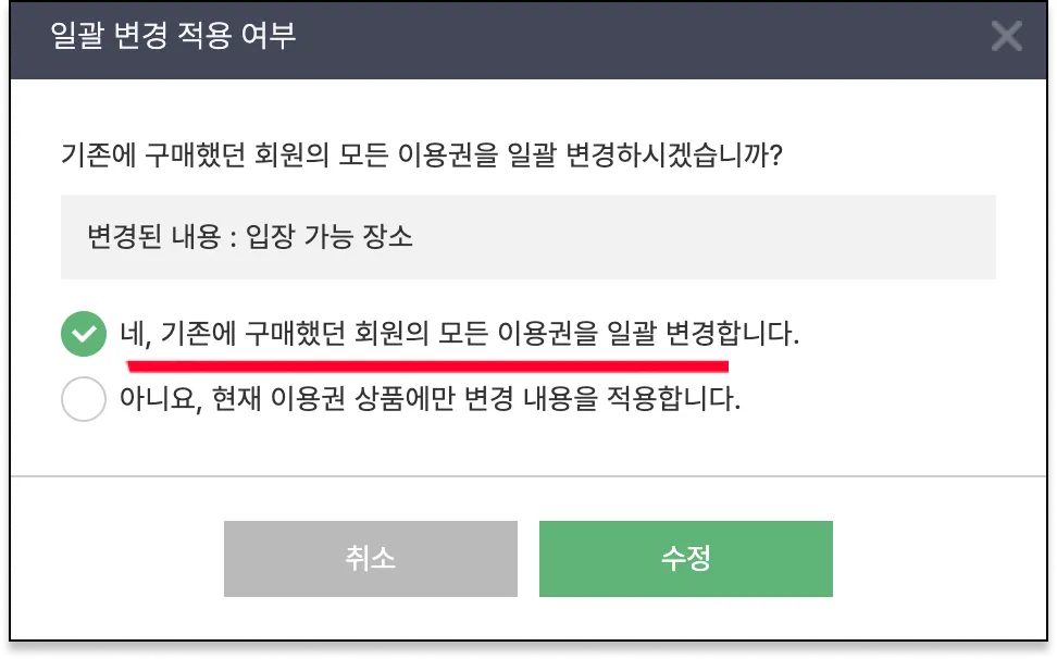 이용권의 장소 설정을 변경할 경우, 이미 판매한 이용권도 모두 일괄 적용시킬 수 있어요!