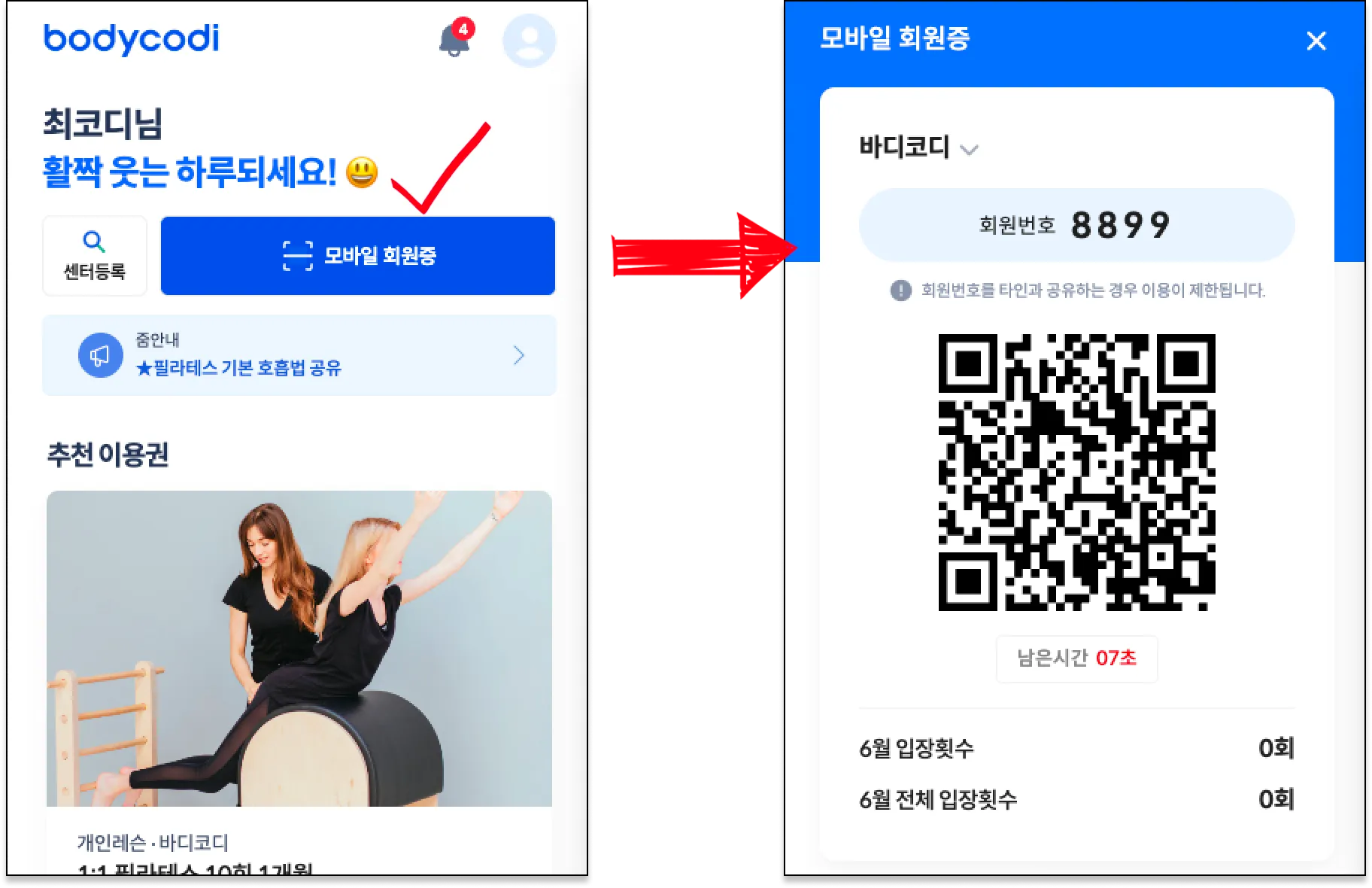 바디코디 회원앱의 모바일 회원증의 QR로 스캔 후 입장해요.